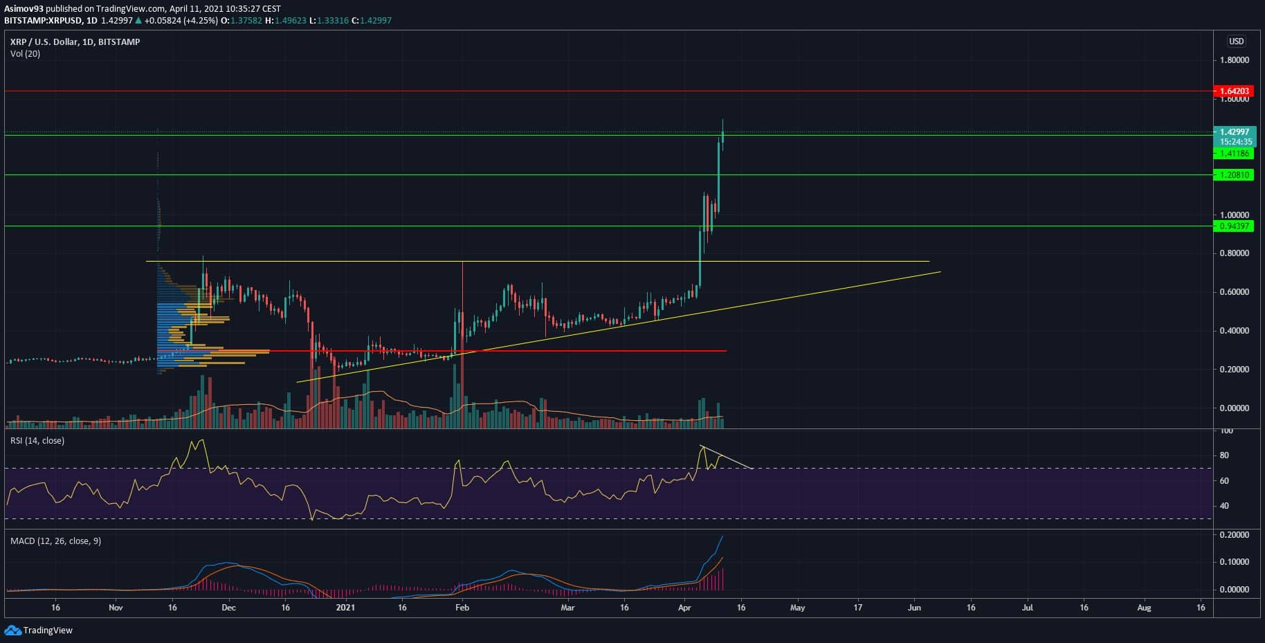 Po docela dlouhé době se dennímu RSI povedlo překonat hraničních 70 bodů a zůstat v tzv. překoupených hodnotách. Uvedené je nesporně známkou velké síly. Nicméně, jak můžete vypozorovat, na indikátoru je docela velká medvědí divergence. Jestli trh na signál zareaguje, hrozí klidně pokles o 30-50 %. Ripple je v tomto ohledu dost nevyzpytatelný. Ovšem podle MACD je trh hodně býčí a bez divergence.