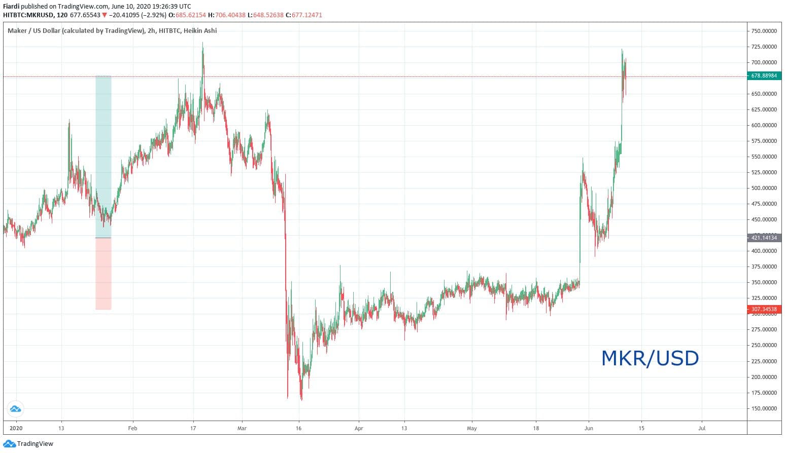 Maker byl 08.06. přidán na Coinbase Pro a jeho cena po zalistování i nadále roste. Momentálně se pohybujeme na hodnotě 689 USD. Nejbližší odpor vidíme na 700 USD. Samozřejmě vývoj na grafu není vývojem po TA stránce a celý pohyb je silně ovlivněn fundamentem zalistování. Podporu vidíme již na hodnotě 418 USD a pak na 549 USD. Jak vidíme na grafu, i po zalistování je MKR v růstu. Je třeba si ale dát pozor na následující dny před propadem.