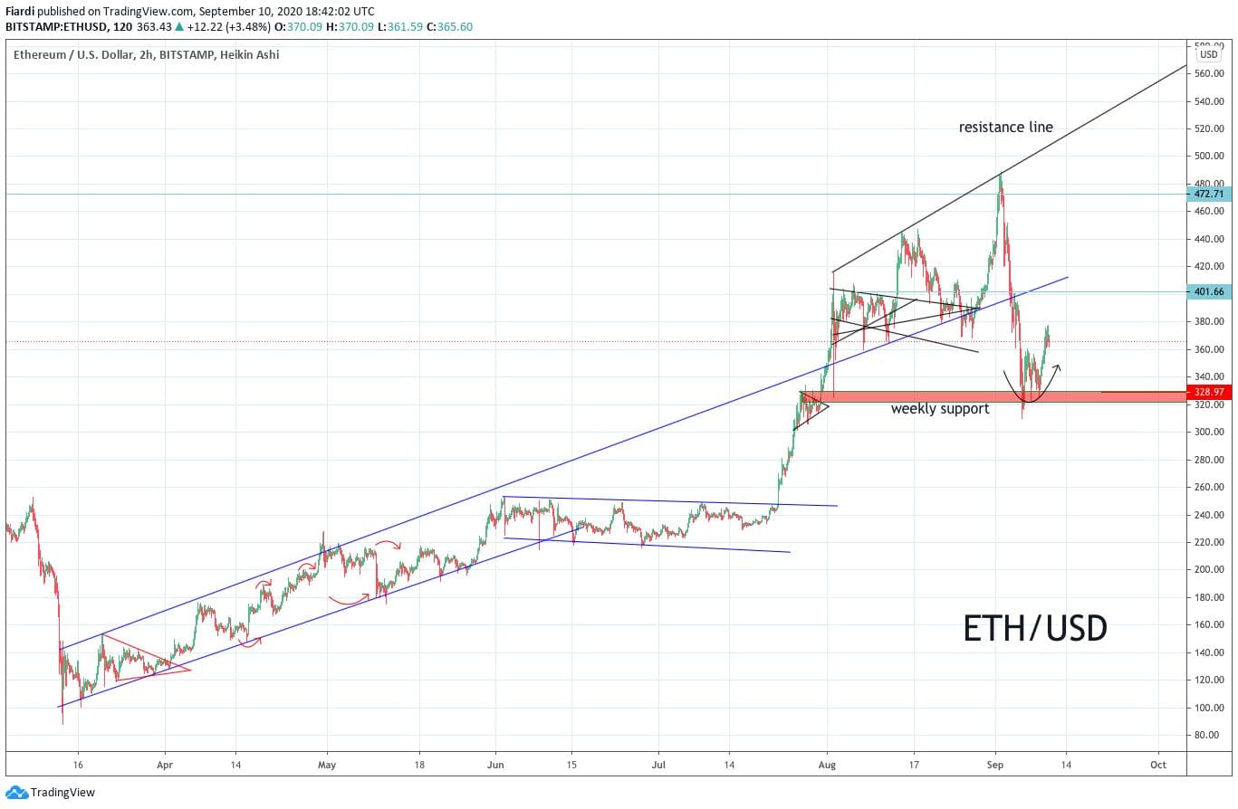 Ethereum se momentálně pohybuje na hodnotě 366 USD, ale asi si všichni pamatujeme, že ještě před pár dny to bylo 485 USD. Dostaneme se znovu na top hodnoty?