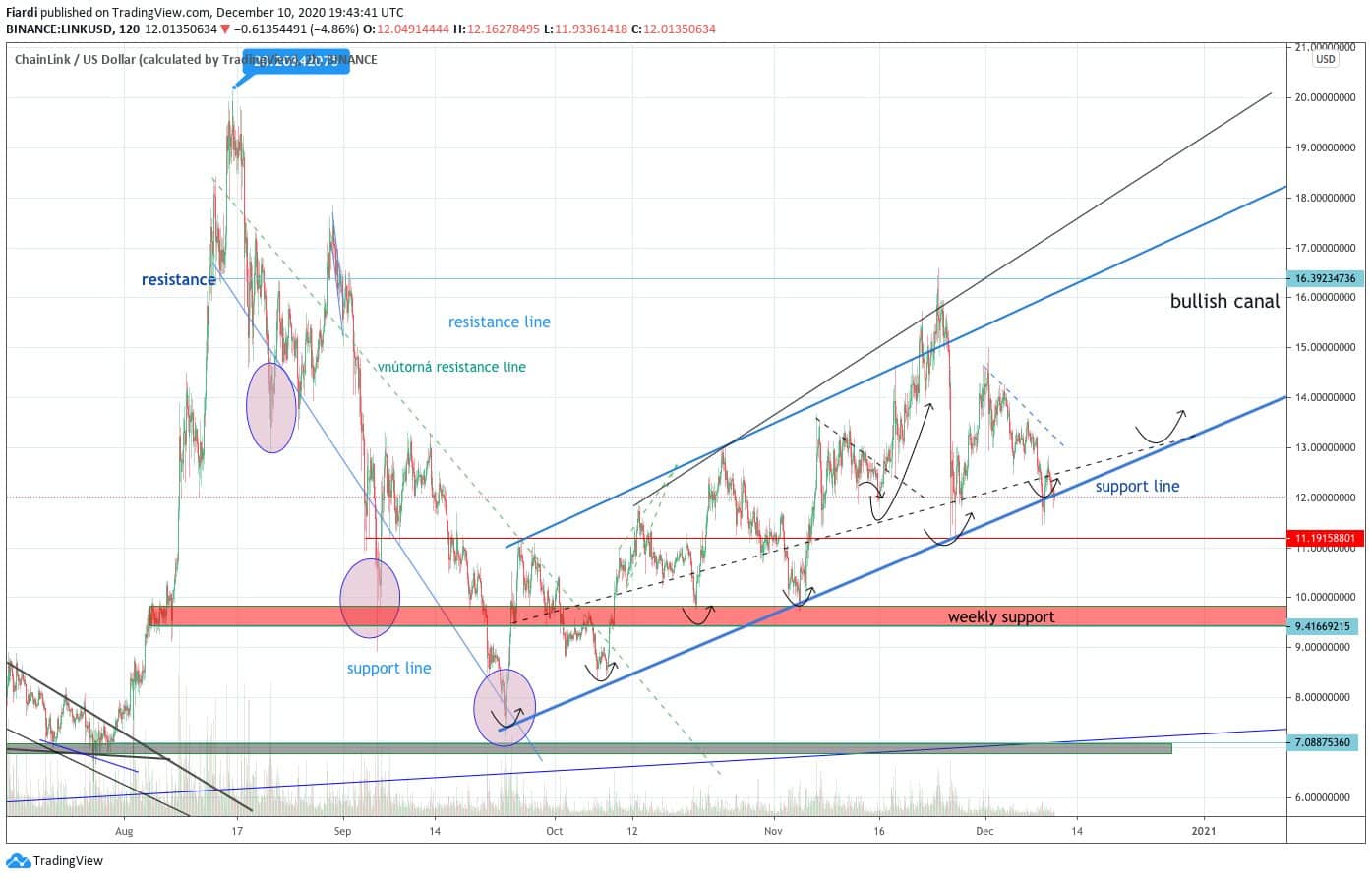 Chainlink vytváří trendový pattern bullish kanálu. Momentálně sledujeme hodnoty kolem 12 USD, kde se nachází support line. Odrazíme se znovu k 16 USD podobně, jak tomu bylo začátkem listopadu?