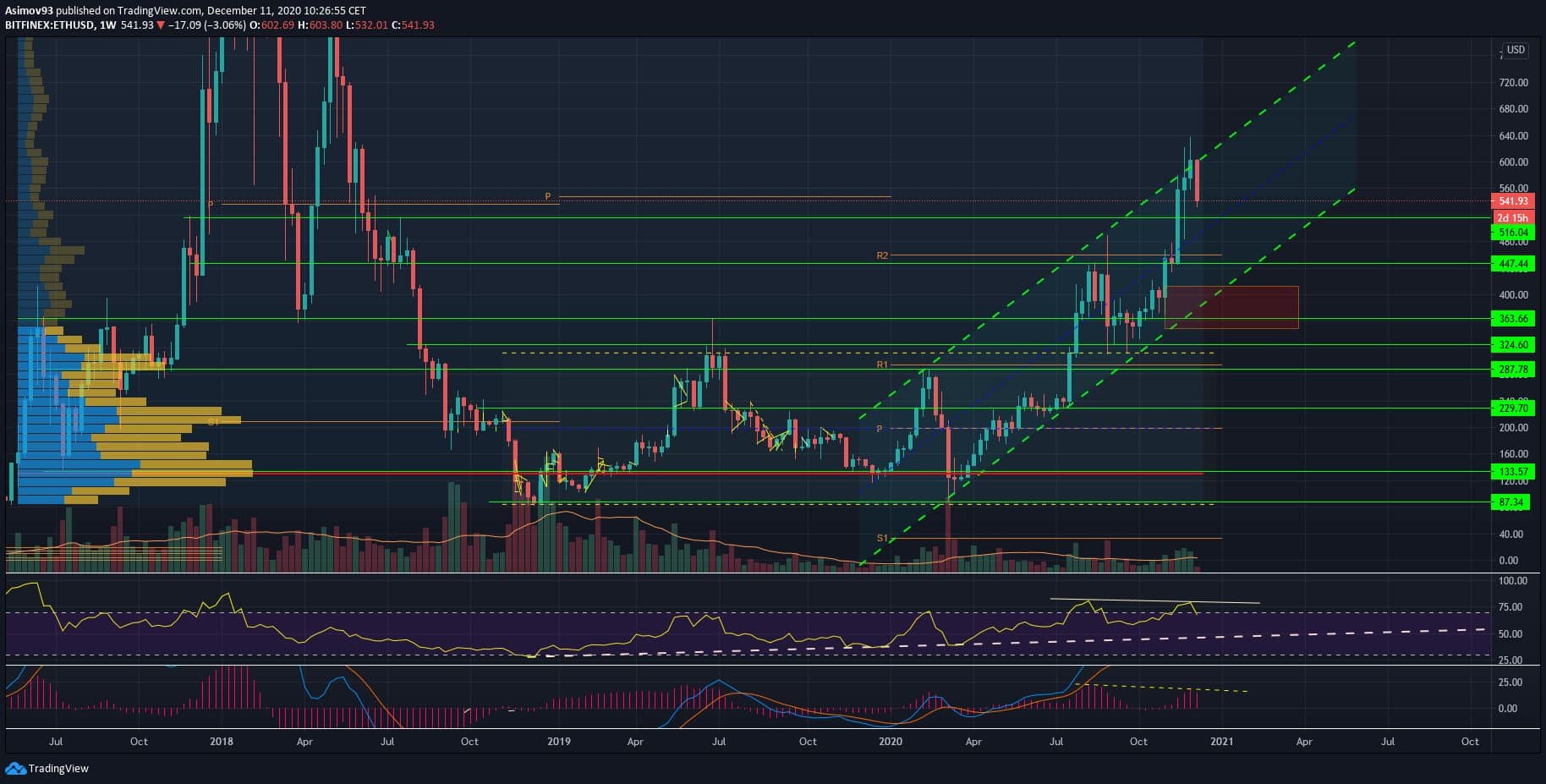 Jsem však dost skeptický, že ta podoba bude nakonec lepší. Každopádně je první překážkou pro medvědy hranice 516 USD. Až kurz vyklesá až sem, měli bychom se dočkat alespoň nějaké pozitivní reakci. Ovšem největší šanci na odraz vidím až u úrovně 363 USD. U této ceny se nachází horní oblast hodnoty Volume profile a hlavně je historicky 363 USD silným S/R levelem.