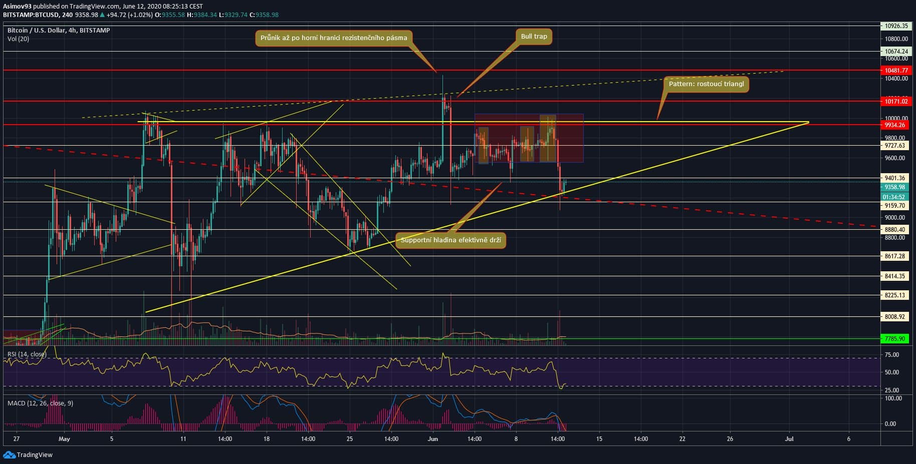 Takže není překvapivé, že dojde po několika neúspěšných pokusech o průraz k výprodeji. Byly určité pochybnosti ohledně relevance zakresleného patternu, ale trh evidentně spodní hranu trianglu vážně bere. Úplné zastavení propadu nastalo až na S/R levelu 9 159 USD, ale po menším pushu kurz konsolidoval právě u té spodní hrany a pak nastal menší odraz.