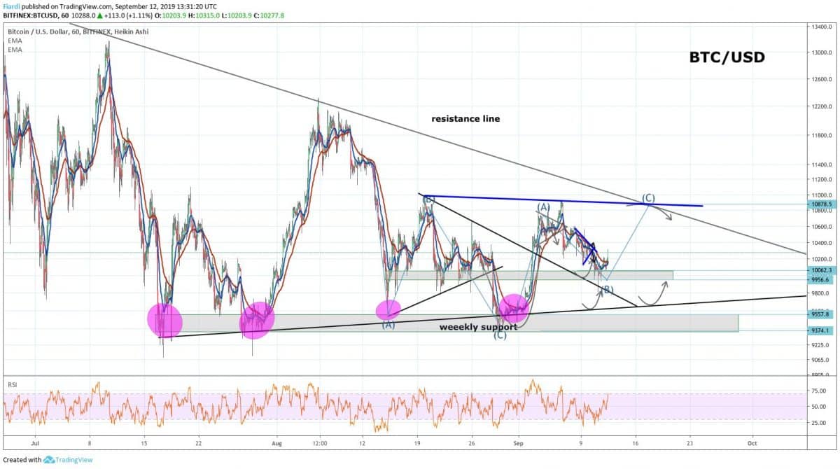 V poslední TA na BTC jsme predikovali odraz na supportu 10 000 USD k hodnotám 10 500 USD. Předpokládal jsem, že se může BTC odrazit od 10 700 USD linie resistance směrem dolů k 10 000 USD. Při tomto předpokladu, který už BTC započal, by měl BTC zastavit až při weekly supportu na 10 000-9800 USD následně bych očekával aktivitu bulls a nárůst BTC znovu k 10 850 USD resistance line .