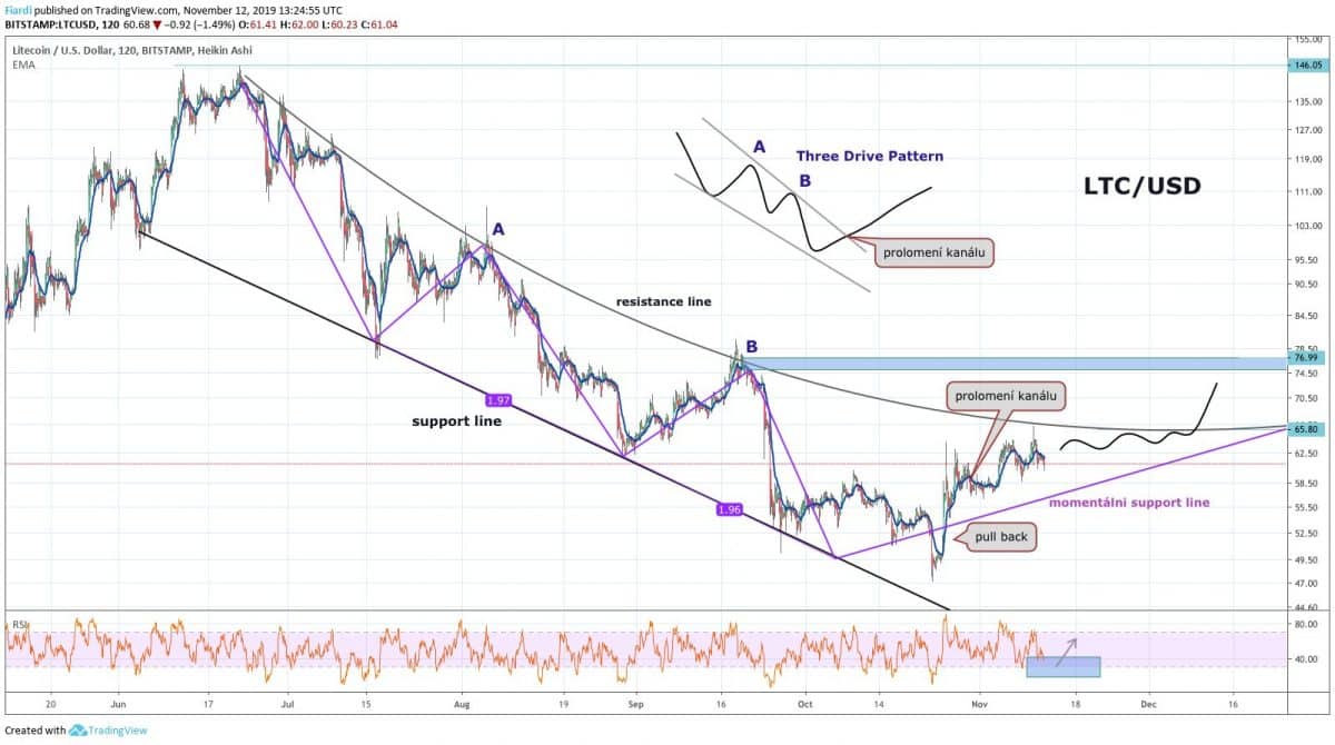 Three drive pattern na Litecoinu se vytvořil během poklesu trhu nejen na LTC / USD páru. Pro tento pattern jsou typické dva triangly uvnitř kanálu, avšak při tvoření trianglů nesmu být porušeny stěny klesajícího kanálu.