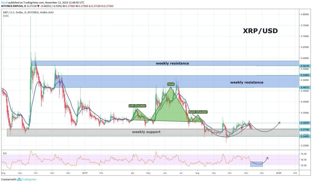 Cyklus kulatého dna je ukončen a podle blízkého supportu na 0,27 USD by se mohl XRP znovu odrazit a vytvářet vlny na hodnotách 0,31 – 0,27 USD. Následující růst podporuje i RSI.