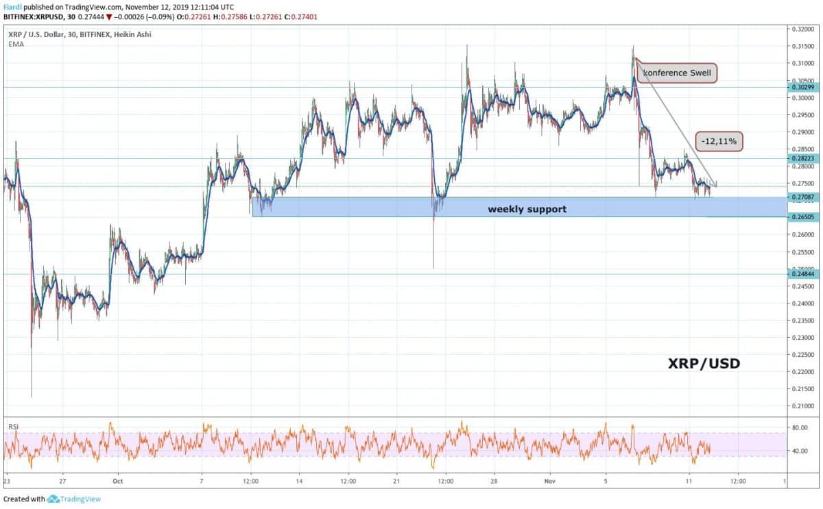 Při pohledu na graf výše vidíme, co se stalo po konferencí Swell, která proběhla 07.11.2019. Na grafu je viditelný 12% propad. Momentálně se dostáváme znovu na support na hodnotách 0,27 USD. Při zvětšeném grafu a pohledu na vývoj hodnoty XRP v roce 2019 vidíme jak konferencí Swell využil, aby dokončil pattern kulatého dna.