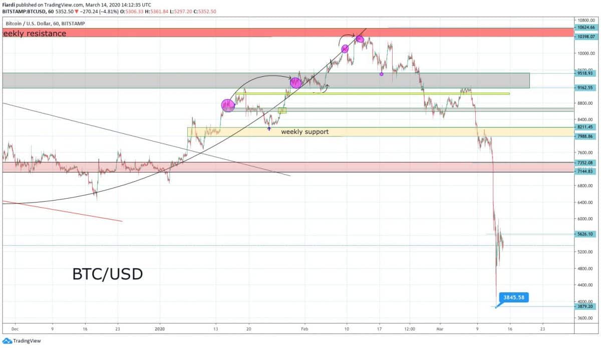 V pondělí se znovu otevřou trhy a začne se obchodovat, předpokládáme, že dojde k výraznému pohybu. Momentálně se Bitcoin nachází na 5 330 USD a cena se o víkendu trochu stabilizovala těsně nad 5 000 USD. Ještě v pátek jsme ale viděli pohyb těsně pod 4 000 USD. Situace je vážně zlá, stejně jako světové trhy tak i Bitcoin jsou v bear marketu. Propad Bitcoinu jednoznačně souvisí s koronavirem a ekonomickým dopadem na světové trhy a ekonomiku států. Na grafu nevidíme nic pozitivního ohledně růstu, právě naopak. Pokud se situace ve světě s koronavirem nedá do pořádku, nemůžeme očekávat zlepšení světových trhů a tím pádem ani pozitivní dopad na Bitcoin.