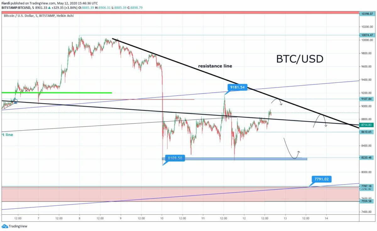 Včera se Bitcoin pohyboval na 8 900 USD a viděli jsme větší růst. Low včerejška byl na 8 532 USD (Bitstamp). High jsme zaznamenali na 8 900 USD, vskutku velký růst za včerejšek. Důvodem je halving. Média propagují Bitcoin a halving je velkou věcí. Den po průchodu halvingu a snížení odměn pro těžaře na 6,25 BTC za block vidíme mírný růst o téměř 400 USD. Stále to ale nestačí, protože silný odpor vidíme na hodnotě 9 100 USD. Pokud se investorům nepodaří překonat tuto hodnotu, o dalším růstu pochybujeme z pohledu 1-7 dní.
