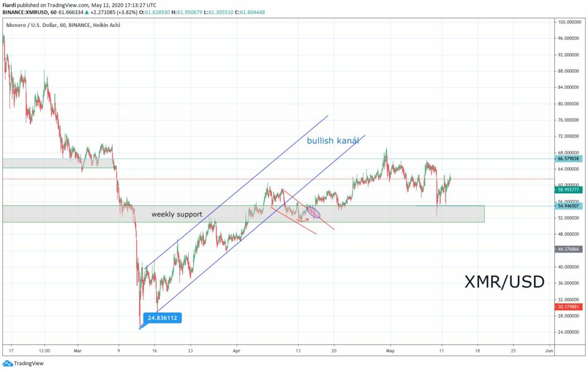 Podíváme se také na graf Monera. Momentálně jsme na hodnotě 61,6 USD. Jak vidíme na grafu, už máme prolomen bullish kanál a situace je zcela odlišná od Bitcoinu. Za včerejšek vidíme téměř 4% růst. Důležité pro XMR bude nyní držení weekly supportu a odrážet se směrem vzhůru, jak jsme to viděli už podruhé. Momentální podpora je na 54,9 USD. V rámci růstu můžeme mít prostor k hodnotám 67 USD. Hodně bude záviset na Bitcoinu, zda se mu podaří prolomit 9 100 USD odpor. Pokud ano i XMR by mohlo růst nad 67 USD. Následující odpor je až na 85 USD a tak by si XMR od současné hodnoty polepšil až o 38,4%. Stejně jako před halvingem i po halvingu jsou všechny oči na Bitcoinu a investoři sledují, jaký směr udají velryby pro nejbližší dny / týdny.