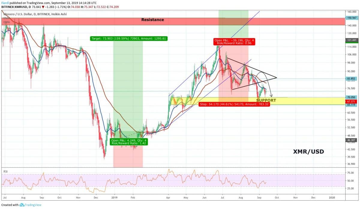 Vítejte tradeři u dalšího updatu na pár XMR / USD. Při pohledu na graf níže vidíme zajímavou statistiku. XMR dosáhl v roce 2019 až 159% nárůst. Mnoho lidí přes léto odradil od obchodování propad altcoinů, ty propadly v průměru o 52%. I v této statistice Monero pozitivně překvapilo, když zaznamenalo propad „jen“ 44%. Monero se tak zařazuje do balíčku těch lepších altcoinů.