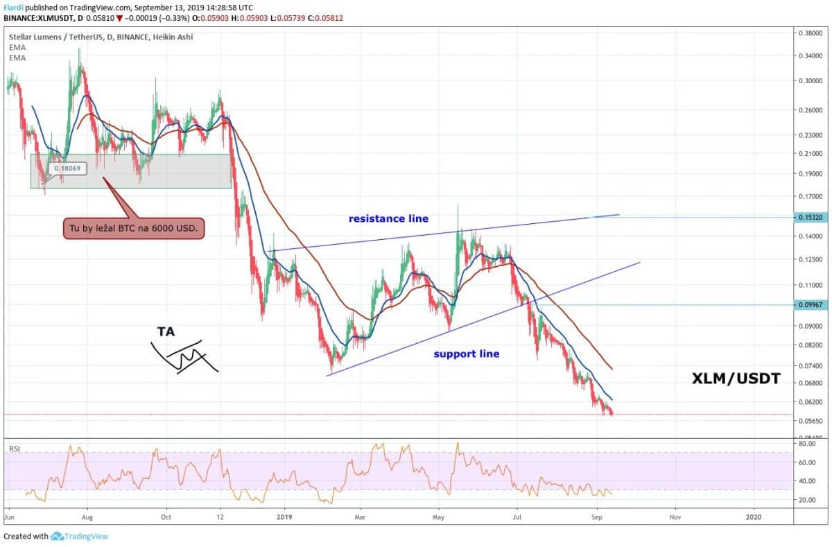 Dnes se podíváme i na TA: XLM/USD. V levém rohu máme zaznamenaný TA pattern. Jak můžeme vidět na grafu, tento pattern se dokonale vyplnil. Během léta propadly altcoiny v průměru o 52%, ale na XLM vidíme propad už na nové dno z ATH. XLM je tam i přes to, že mnohé altcoiny v roce 2019 rostly. V bear marketu je od konce roku 2017. Udivuje mě, že navzdory těmto skutečnostem se na mě mnozí obracejí z otázkou: Co si myslíš o XLM nebo vyplatí se do XLM investovat? Moje první myšlenka je podívat se na graf a zhodnotit si fakta. XLM v roce 2019 narostl na top o 44% a to počítám i knot na 1D. Pokud bych knot nepočítal a bral pouze tělo na 1D, bylo by to 28%. Současný propad od topu (pouze tělo) je 60%. Ještě jednou si zopakujme, že průměr na celém altcoin trhu je 52%. XLM tak patří do té horší skupiny coinů, která nemá stabilitu a co je nejhorší, v roce 2019 nemá ani výsledky. Jaká je tedy odpověď na otázku „zda se vyplatí nakoupit XLM“. Pokud to z kontextu (ne)vyplývá, odpovězte si na to sami. Stojí to riziko za to? Například oproti x násobku na EOS, LTC (samozřejmě ho táhl halving), ETH (ETH2.0 v 2020), LINK (ATH), BTC (halving 2020), BNB (ATH)?
