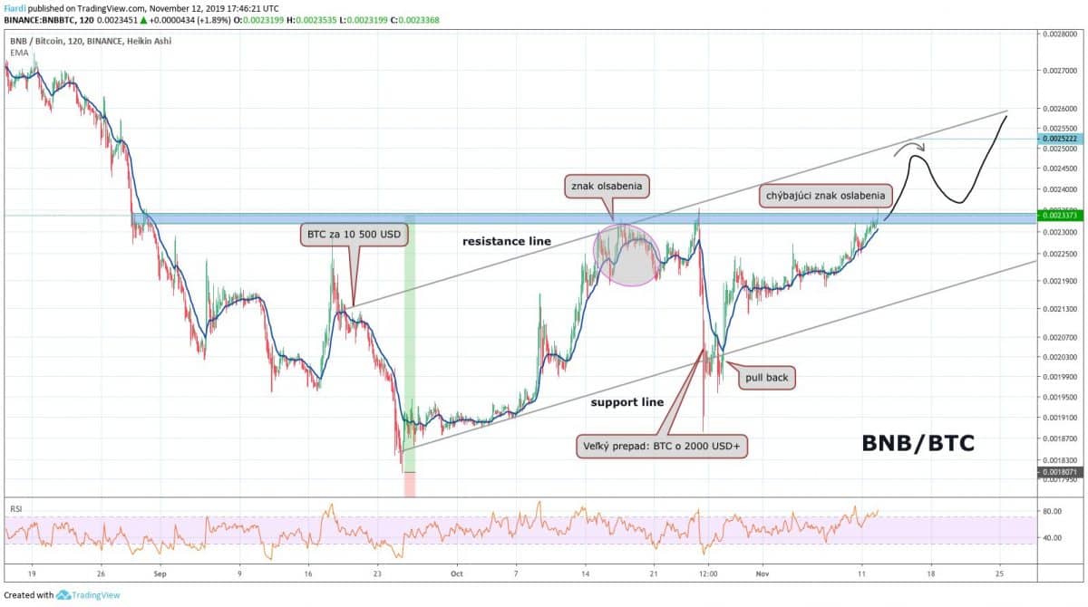 Podíváme se rovněž na pár BNB / BTC. Situace na BNB / USD ale i BNB / BTC je velmi dobrá. Představím několik argumentů, proč to zatím vypadá na růst k resistance line 0,00252 satoshi.