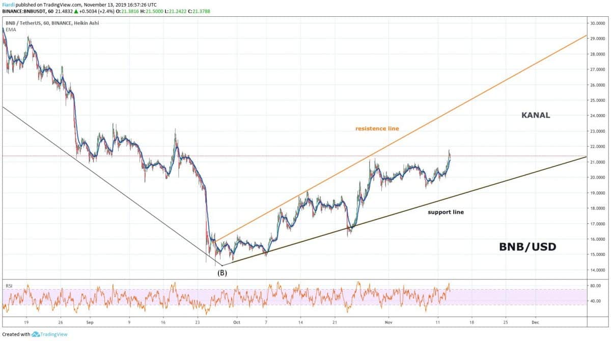Je jasné, že se support line bude posouvat vzhůru v průběhu pohybu BNB tak jako naposledy, kdy byla support line na 18 USD a dnes je již na 21,48 USD. Nákupy ale někde pod 30,5 USD už budou s neskutečně dobrým potenciálním profitem, potenciál kanálu na BNB poukazuje na růst až k 38 – 40 USD za kus.