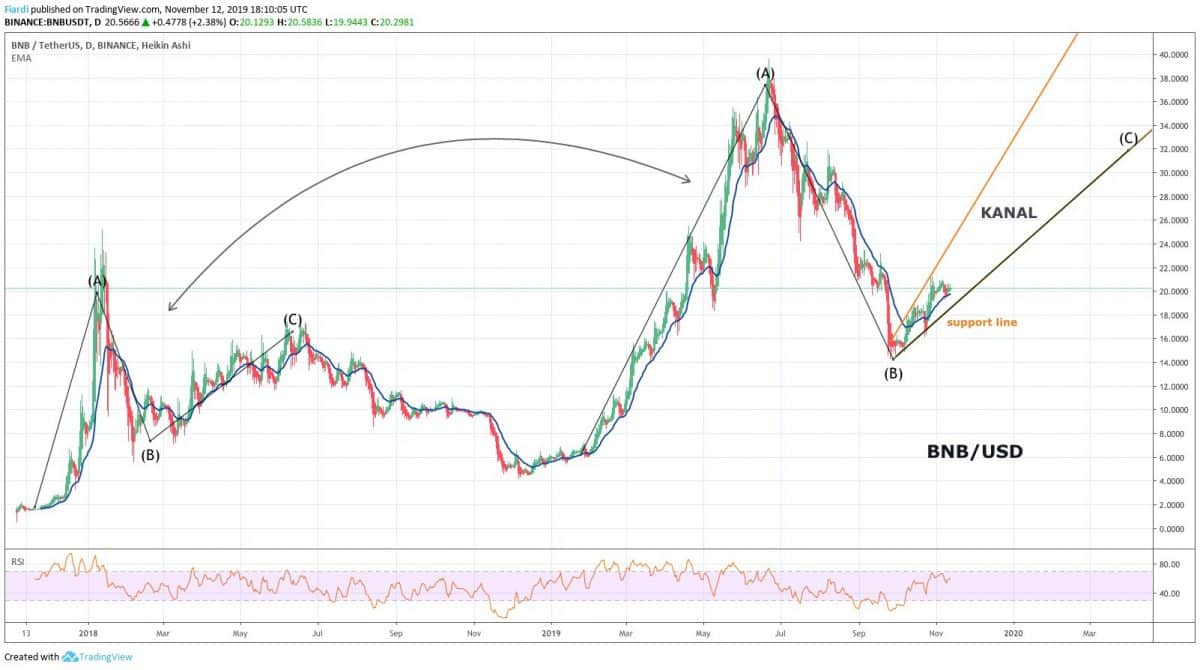 Zajímavý je určitě i pohled na BNB / USD z pohledu tří let. Na grafu níže vidíme pattern ABC. Podle tohoto patternu vidíme fraktální podobnost z momentální situací, přičemž se nacházíme na vlně C. Vlna B charakterizovala dno. Na BNB jsme viděli letošní dno na 14,23 USD. Od tohoto dna posílil BNB už o 50,91% k současné hodnotě 21,48 USD.
