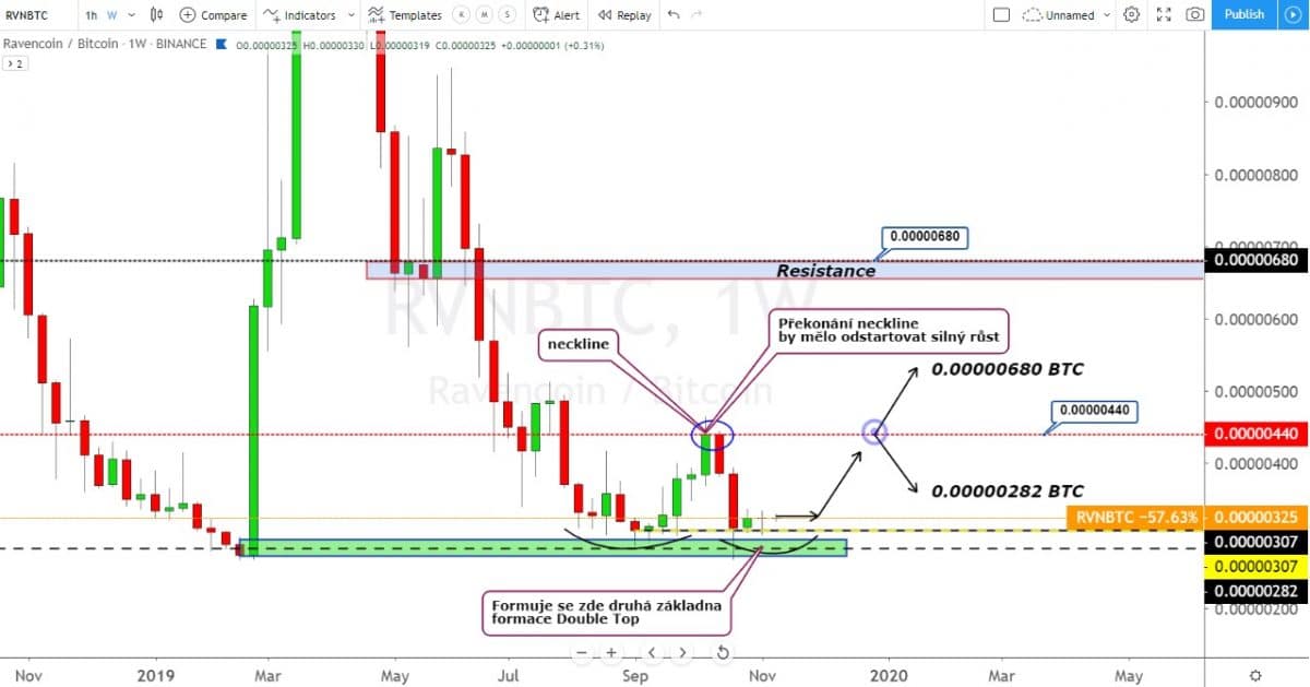 Neměli bychom však mít příliš velká očekávání, neboť celkově je RVN v silném downtrendu. To znamená, že následující pohyb severním směrem může být sice rychlý, ale také se může rychle vyčerpat. V takovém případě by mohla přijít nepříjemná korekce zpět k úrovni neckline 0.00000440 BTC. Tato úroveň je klíčovou bullish úrovní a její překonání velmi pravděpodobně nastartuje silný růst.