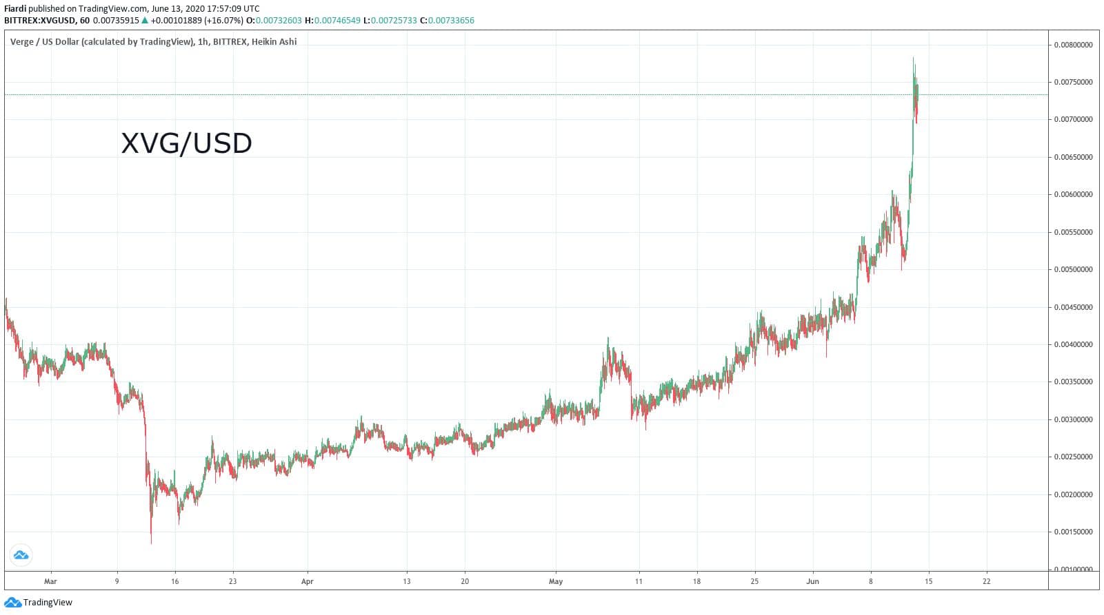 Růst Verge není ojedinělou záležitostí a teoreticky by mohl růst pokračovat až do jeho halvingu. Momentálně se pohybujeme na hodnotě 0,00745 USD. Samozřejmě Verge je jeden z mnoha coinů, který se po bull marketu v roce 2017 propadl o téměř 95 % své hodnoty. Na ATH si ho pamatujeme až na hodnotě kolem 0,20 USD za kus. Momentálně ale prožívá několik měsíců trvající růst, který včera přerostl do 36% pumpy za 24 hod.