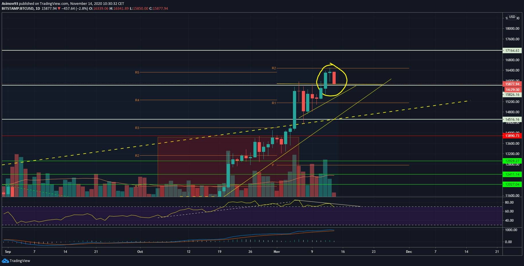 Nyní přejděme do současnosti, kde má aktuální týdenní svíce zatím podobu spinning top (točící káča) – je to neutrální svíce, ale naznačuje váhání. Musíme ale však vzít v potaz, že k týdennímu close je ještě docela daleko a ve finále může mít zcela jinou podobu. Cenově jsme každopádně na půli cesty k S/R levelu 17 163 USD, což je asi poslední podstatná cenová rezistence před ATH úrovní.