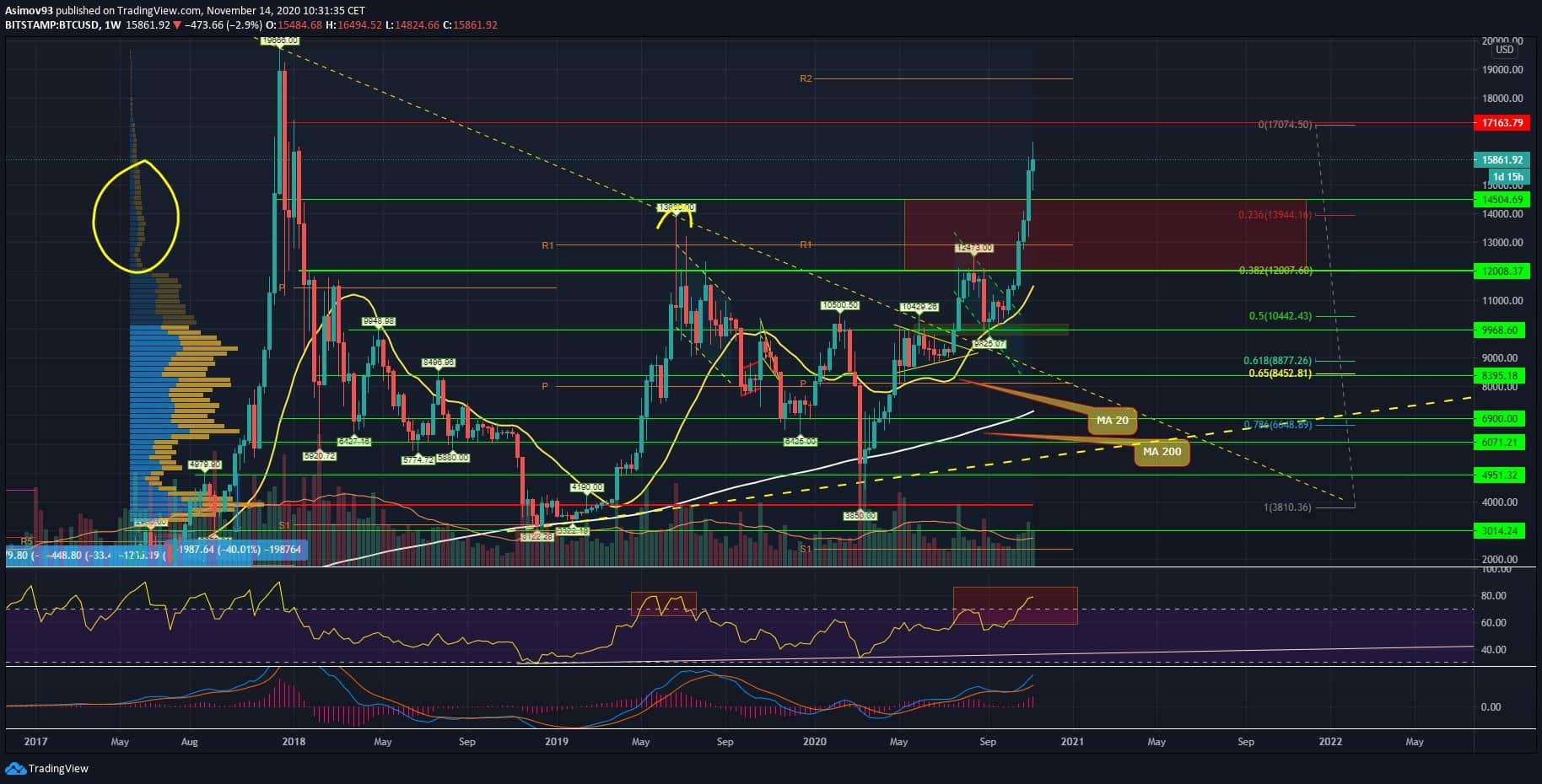 Většinově panuje shoda, že krátkodobě je těch cca 17 000 USD asi vážně strop. Asi by všechny dost překvapilo, když by cena zaútočila až na 20 000 USD, ale nic se nedá ze 100 % vyloučit. Nicméně, když by cena začala tenhle víkend padat, tak reálný odraz je až na 12 000 USD, kde je i 38% retracement dle fibo. Zároveň je tu samozřejmě support na základě volume profile.