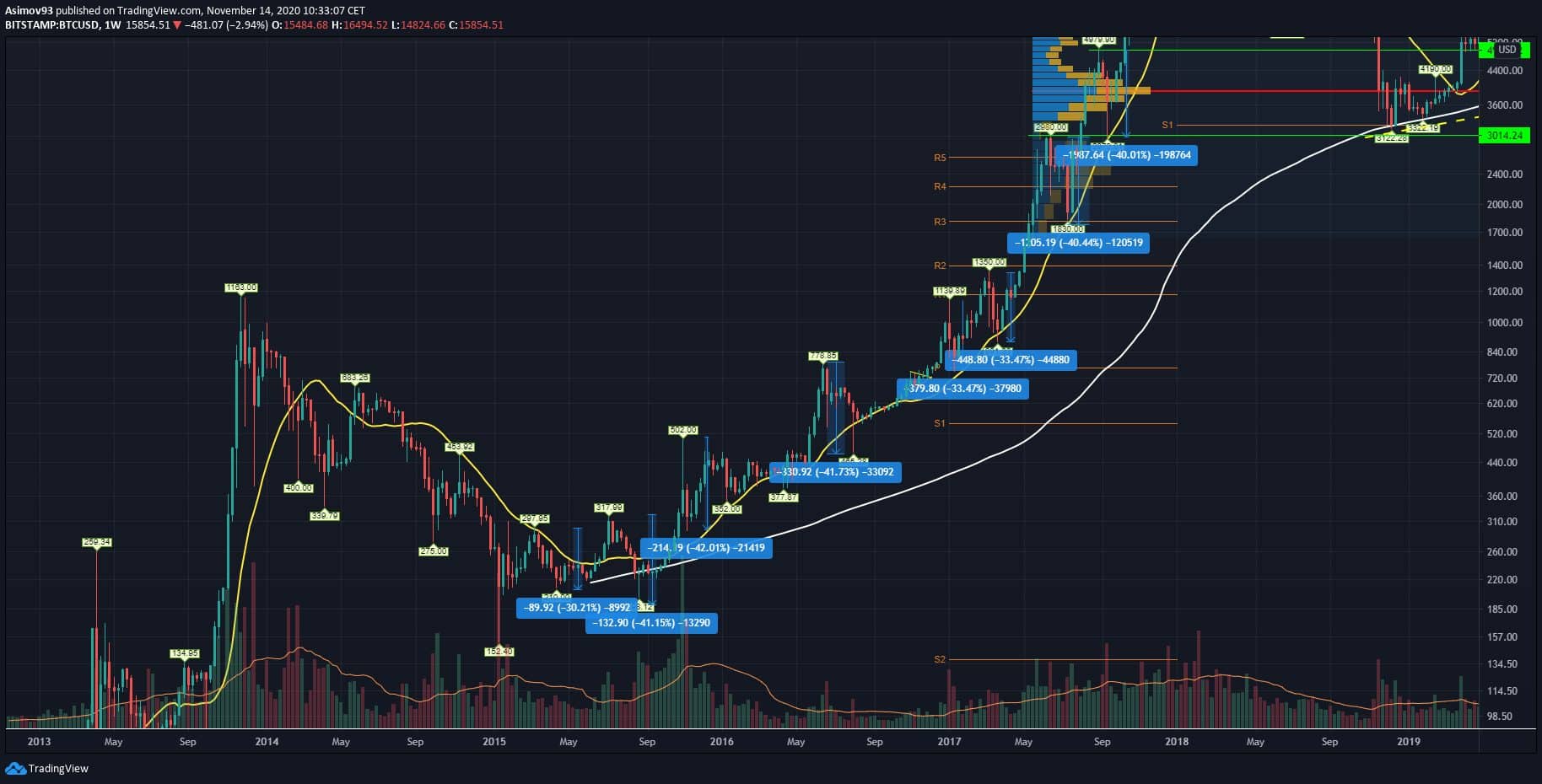 Pozitivní sentiment je zase až ve stropu a jde to poznat jednak ze sociálních sítí, webu, ale i z komentářů pod mými analýzami. Čím častěji čtete proklamace, že hlubší korekce už nepřijde a půjdeme s cenou pouze nahoru, tak to lze s nadsázkou označit jako strong sell. Každopádně přikládám týdenní graf, kde je cenový průběh předcházejícího býčího cyklu.