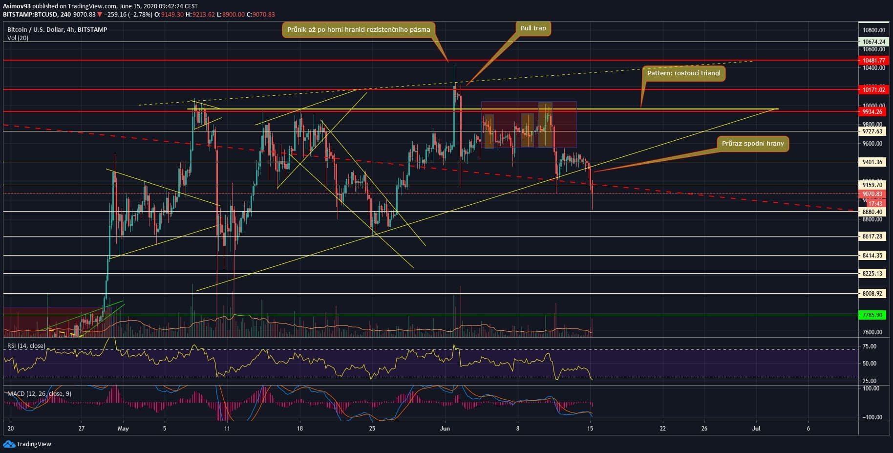 Tak poslední analýzu na Bitcoin (BTC) jsme měli v pátek a vzhledem k tomu nočnímu propadu je na čase se na trh znovu podívat. Abych řekl pravdu, tak se mi začíná zdát, že do konce června se ten bull run asi nestihne. Respektive, čím dál budeme od toho klíčového rezistenčního pásma 9 934 USD – 10 481 USD, tak tím menší je pravděpodobnost, že to býci stihnou pushnout skrz.