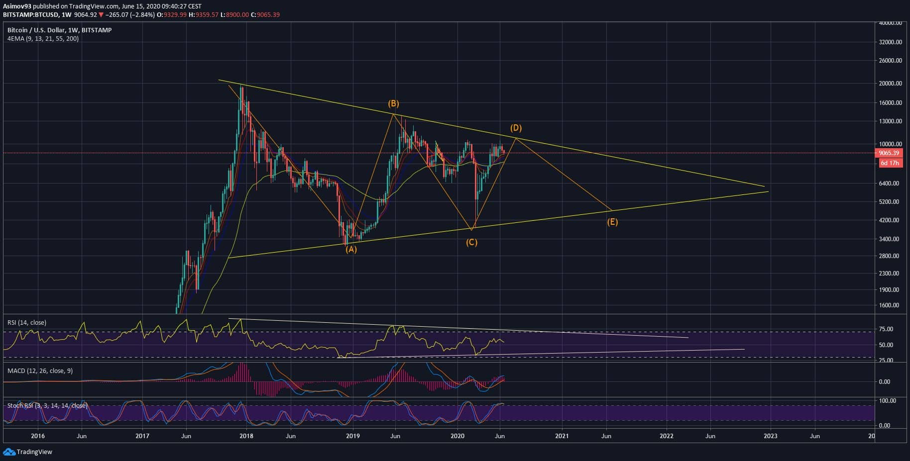 Já už nějakou tu dobu počítám s tím, že dojde k vytvoření vlny (E) a že si zkrátka na ten bull run minimálně rok počkáme. Mně osobně to třeba vůbec nevadí, protože výsledná struktura na měsíčním grafu by byla extrémě bullish.