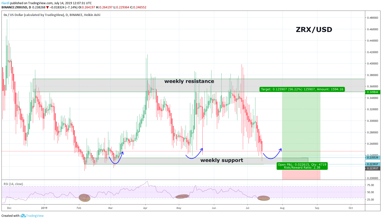 Momentální pohled na ZRX zřejmě jen podle grafu vidíte kde nakoupit a to nemusíte ani ovládat TA. Momentální podpora na ZRX je na 0,235 USD a stejně jako support úroveň i RSI hlásá silný buy. Na ZRX je potom potenciál 56% upu k resistance na 0,345 USD jak to vidíte na grafu. Dotáhnutí tohoto topu k resistance zřejmě dojde koncem 08/2019 nebo v průběhu 09/2019 měsíce.