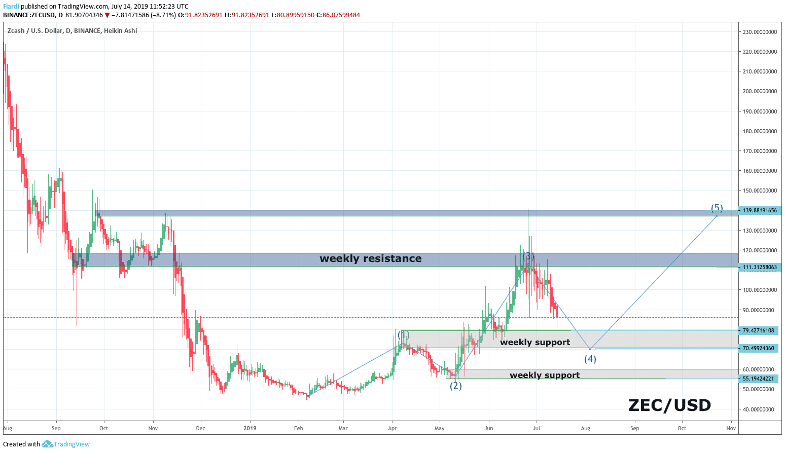Možná se to zdá na tom trhu jako šílený propad no takový propad jen rozbouří vlny. Je to jako kdyby jste hodili kamínek do jezera. Stejně by to mělo být i na tomto trhu pokud si všimnete začátek roku 2019 na ZEC ten rozptyl propadů a následného pumpu byl v té době velmi velký, ale teď nám to připadá minimálně. Stejně to bude pokud se podíváte o rok na momentální datum kde si řekneme že to bylo nic. Tyto propady a vysoký up byly typické pro propady v bear marketu 2018 stejně to bude i nyní jen s bullish verzí. Třeba najít support a hodně nakoupit z odrazem nahoru. Zřejmě ten odraz nahoru přijde v 08/2019 měsíci. Přičemž 140 USD bychom mohli dosahovat buď koncem 08 nebo až v průběhu 09 měsíce.