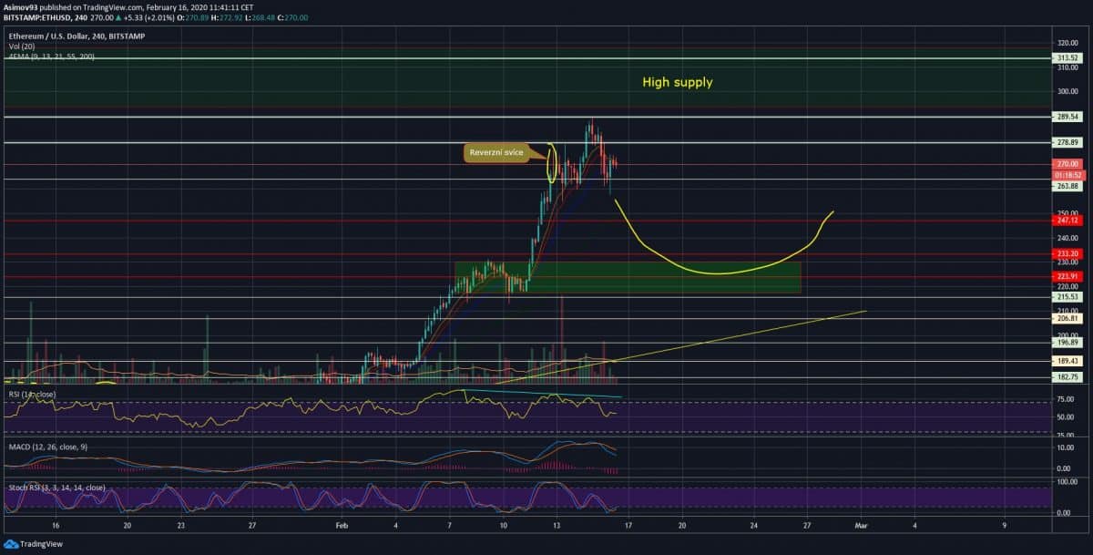 No, jak mám ve zvyku, tak i tentokrát v rychlosti naváži na svůj poslední příspěvek z 8. února, kdy mělo Ethereum (ETH) před tím krátkým zaváháním. Kolem úrovně 223,91 USD se začal tvořit konkávní tvar (obrácené U), takže jsem si už začal říkat, že máme vymalováno. Nicméně, support 215 USD situaci zvrátil a následně pozitivní setrvačnost nabrala ohromnou sílu a cena se díky tomu vyšponovala až po rezistenci v cenovém levelu 289,54 USD. Už dříve ale došlo k náznaku, že trh slábne. U S/R levelu se totiž vytvořila reverzní DOJI svíce a opravdu se pak zvýšil prodejní tlak.