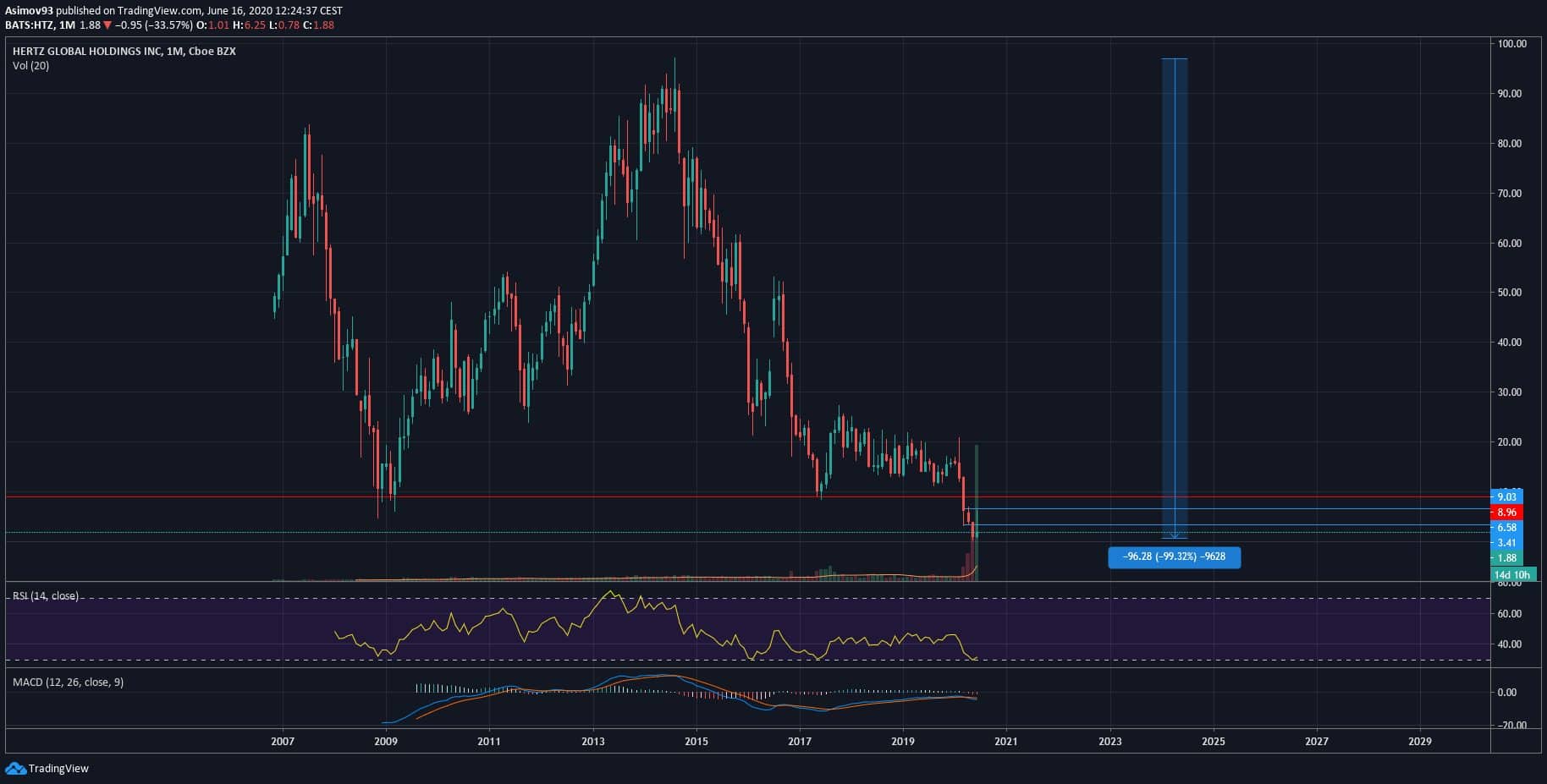 Co se týče zrovna Hertzu, tak i bez znalostí mikroekonomických dat o této společnosti, musel každý technický analytik při pohledu na weekly a monthly TF hned vědět, že s tou firmou je něco špatně.