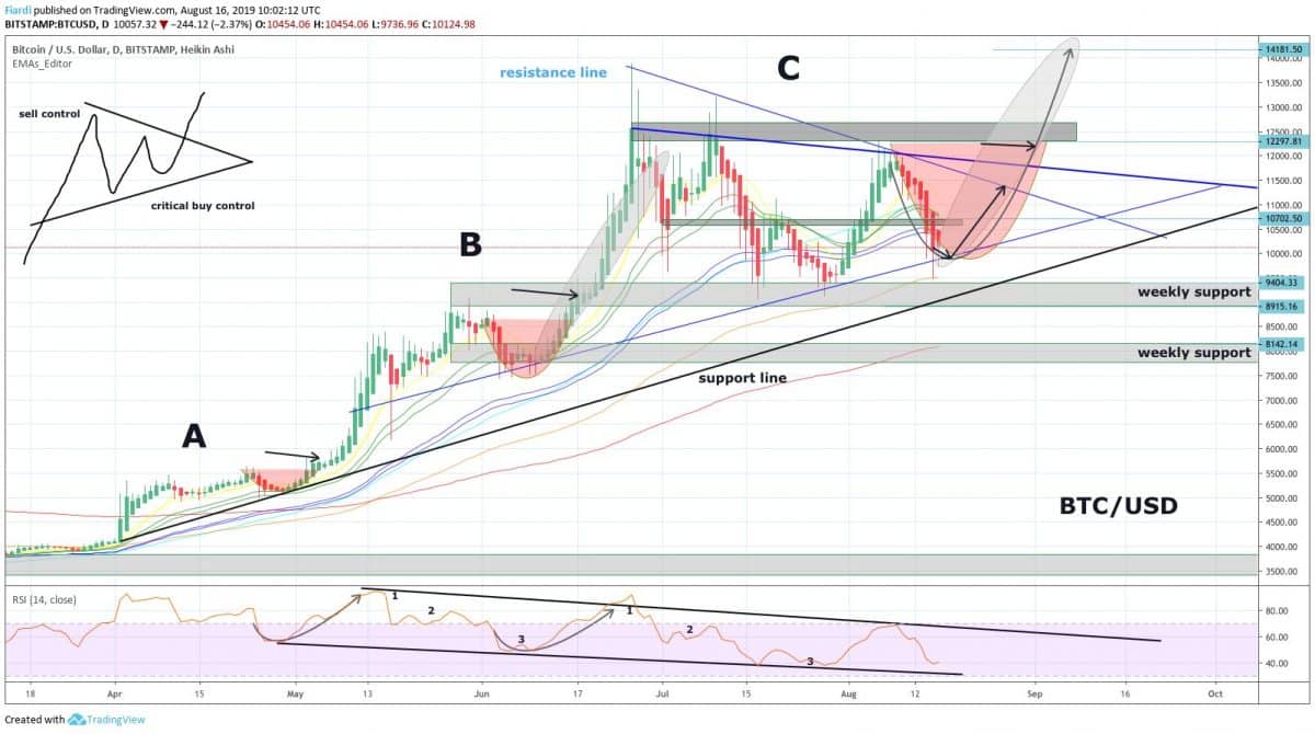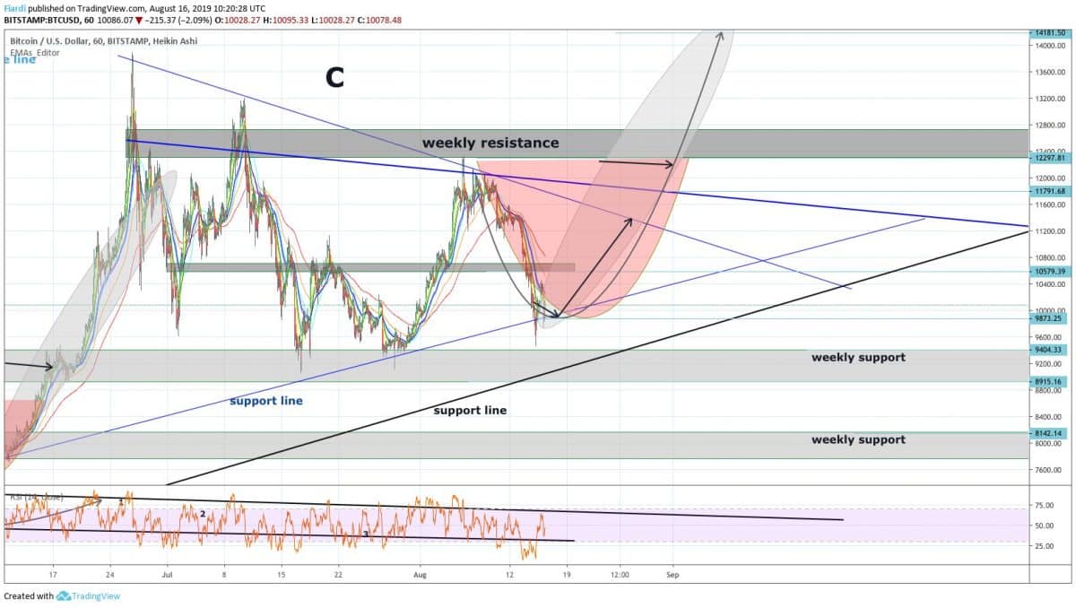 Čína odstranila přes 200 000 BTC a Bitcoin na sebe nenechal dlouho čekat. Při 12 300 USD můžete vidět na grafu zakreslenou support line a zároveň i weekly support kterou jsme zakreslili i v předešlé TA analýze na BTC. Už jen z TA pohledu jsme viděli silné důvody k prodeji na 12 300 USD. Do TA vstoupil i fundament o velkém SCAMU. Výsledek těchto 2 velkých události vyvrcholil očekávaným propadem nejdříve na krátkou podporu kterou mám zakreslenou na grafu při 10 500 USD a následně v posledních dnech k 9 400 USD. Momentálně se pohybujeme na 10 050 USD a na grafu se ukazují první známky nástupu bulls. Podle TA by měly bulls řídit support line trianglu, který je zřetelně patrný na grafu.