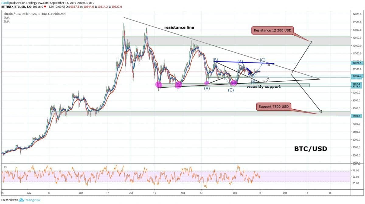 Z pohledu konce trianglu (bavíme o pár týdnech dopředu) budeme ukončovat tuto velkou formaci, nemusíte být odborníkem v TA ani moc zběhlí, abyste věděli, že takové triangly se ukončují masivní pumpou nebo dumpem. Na 7500 USD vidíme nejbližší silný support. To je teorie, že by se BTC pokusil zavřít triangl velkým propadem. Co je však pravděpodobnější, je útok bulls k 12 300 USD, kde zrovna leží silná resistance. 23. 09. 19 bude spuštěn Bakkt, a to by mohlo bulls nastartovat k útoku na tyto resistance hodnoty.