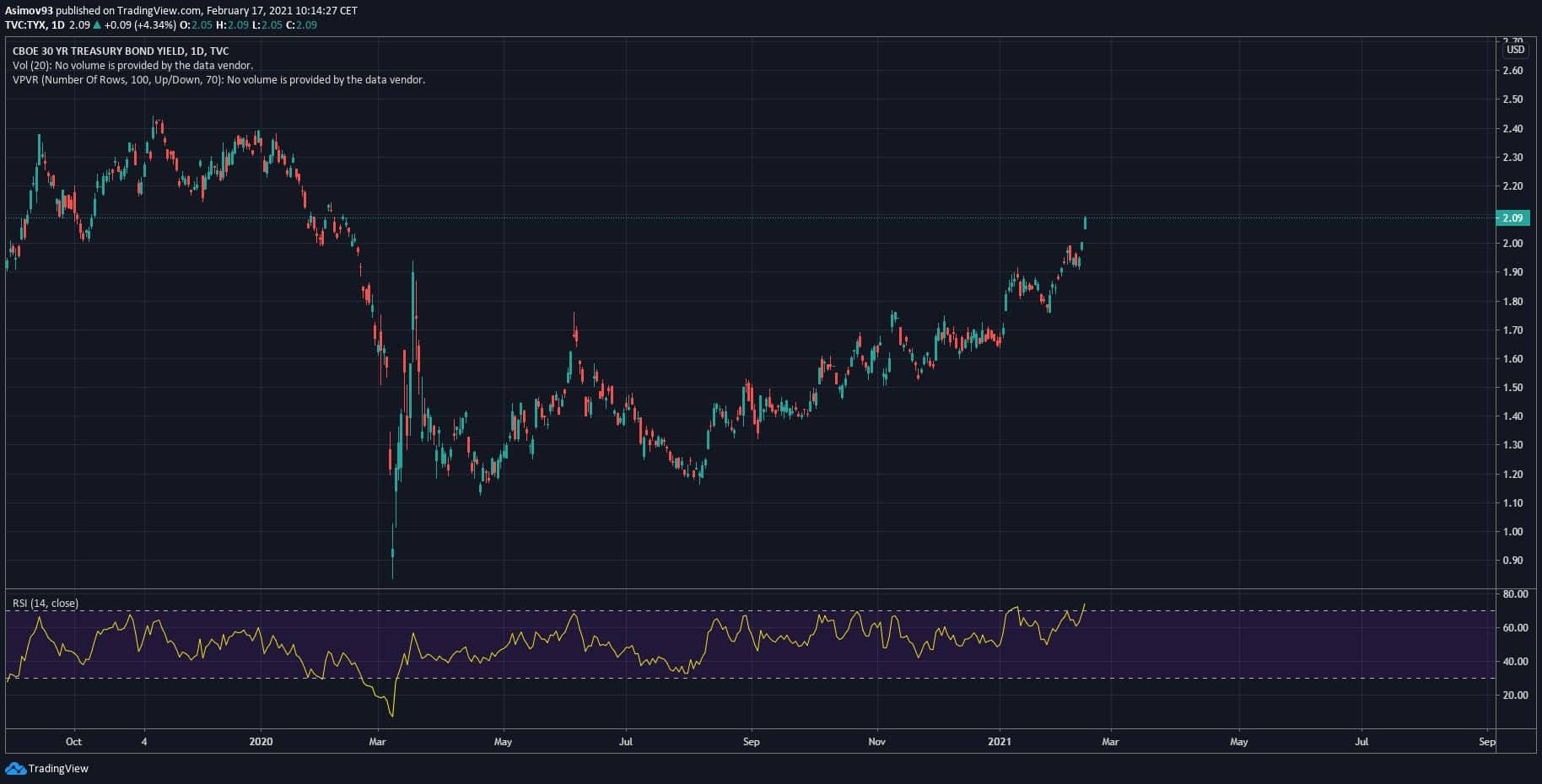 Úrokové tržní míry už jsou nad 2 %, o čemž se už tak měsíc mluvilo jako o potenciální hrozbě. Z potenciální hrozby se pomalu stává realita, protože jak jsem říkal v nedělní video analýze, vysoké úrokové sazby na vládních dluhopisech s delší splatností znamenají, že investoři nejsou ochotni držet cenné papíry. Takže aby se vůbec nějaké prodali, musí růst úroková sazba, aby byli kupci ochotni vzdát se svoji likvidity (peněz). Není na tom nic komplikovaného.