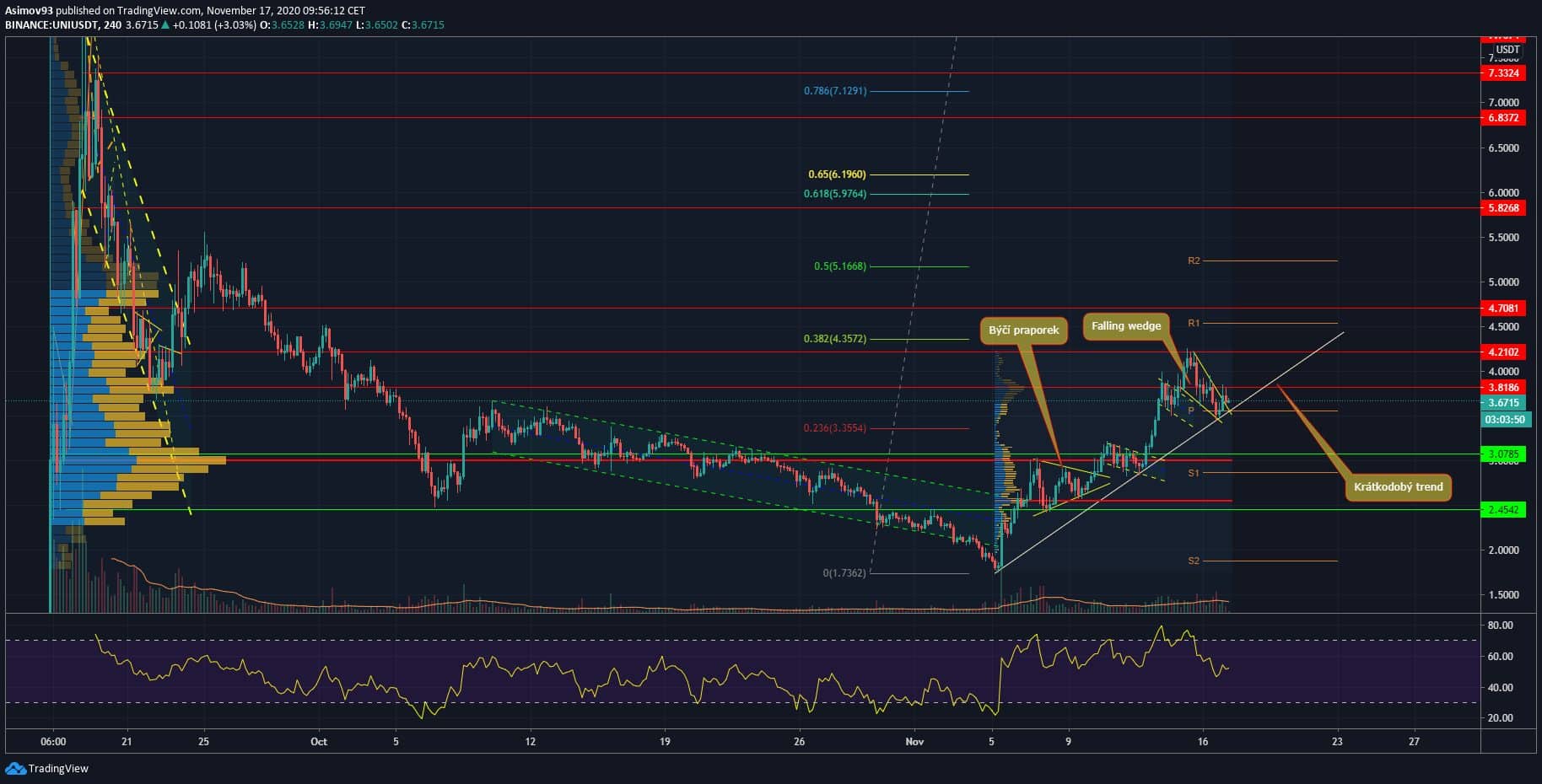 Každopádně Volume profile ukazuje, že point of control je u S/R levelu 3,07 USD. Value area high/low je v rozmezí 4,91 USD – 2,28 USD. Po technické stránce tedy UNI nijak extra z „řady nevystoupilo“. Když přejdeme k tomu aktuálnímu růstu, tak nám trh nabízí krátkodobý trend, který je podmíněn tou zakreslenou diagonálou.