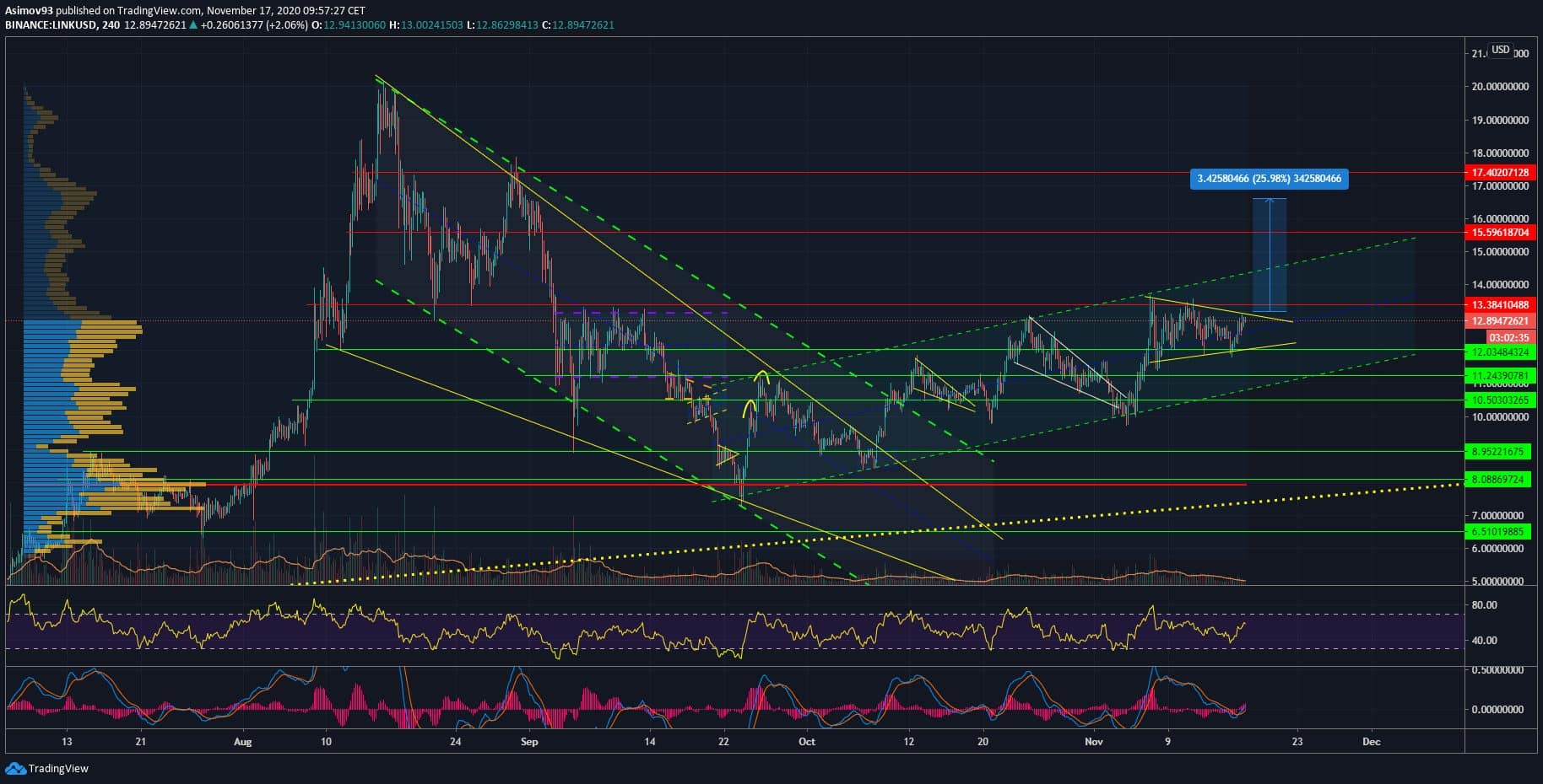 Potenciálním průrazem z toho expanzivního kanálu by se Link asi utrhnul ze řetězu. Co se týče rezistencí, tak S/R level 13,38 USD hned nadvakrát postup kurzu nahoru zamítnul. V blízkostí této úrovně je i value area high, což v tomhle případě funguje též jako rezistence. Pokud se však povede ceně prorazit, tak lze kalkulovat s impulsním růstem ceny.