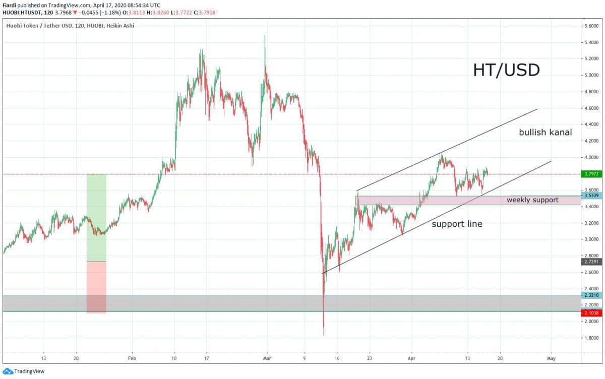 Bullish kanál vidíme i na Huobi Token. Stále pro takové vzestupně rovnoběžné kanály bude platit pravidlo, že investoři vždy mohou být a také budou naloženi v Longu a bude převažovat long tolikrát, dokud udrží support line, tedy spodní stranu kanálu. Pokud ji stále vidíme neprolomenou, není důvod opustit long. Stop loss se každým dnem posouvá výše po support line a tím se minimalizuje riziko ztráty. Nejlepší je pro investory počkat si na support line a tam to dokupovat.