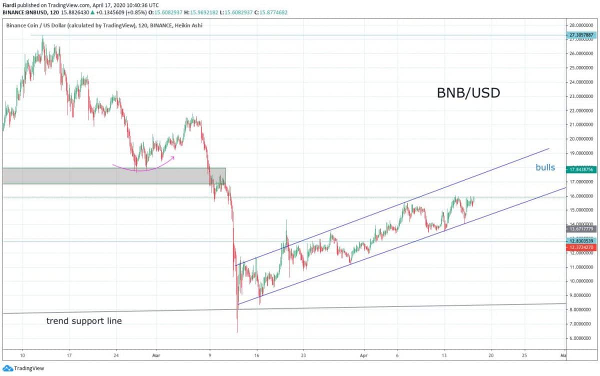 Stejně podobně to vypadá i na Binance Coinu, kde vidíme rostoucí / bullish kanál. Momentálně se pohybujeme na hodnotách 15,86 USD. High v roce 2020 jsme zaznamenali na hodnotách 27,3 USD a analytici předpokládají, že se na tyto hodnoty v tomto roce ještě jednou podíváme. Low 2020 nebo nejnižší hodnoty jsme zaznamenali na 6,4 USD sice knotem, ale přece. V rámci vzestupného kanálu budou investoři stále bullish a platí to, co i u HT. Pokud bude support line držet a nebude prolomena stále budou investoři přihlížet spíše k Longu než k shortu. Stejně takový kanál vidíme i na Bitcoinu.