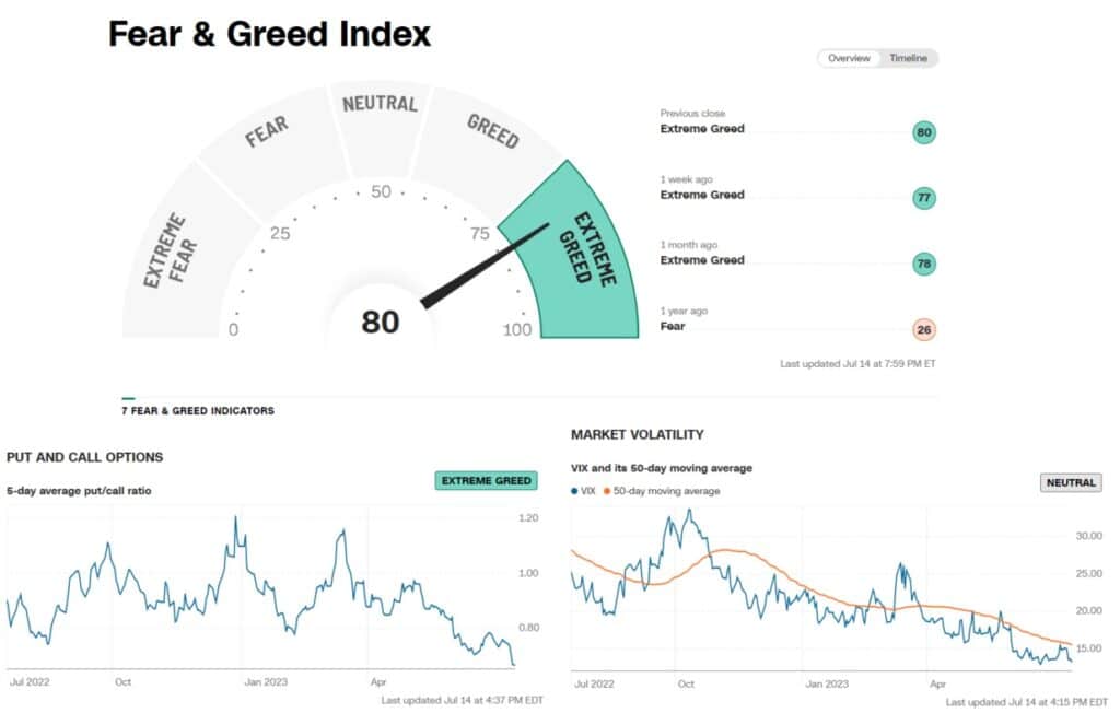 V minulém přehledu trhu jsme se podívali na hodnocení indexu S&P 500 dle poměru P/E, které je značně zvýšené ve srovnání s historickým průměrem. Aktuálně se akciový index S&P 500 dostává do extrémně překoupené zóny s většinou trhu hladovou po dalším růstu a naskakujícím do rozjetého trendu. Index sentimentu trhu (Fear and Greed index) ukazuje 80 bodů, co vůbec není signál pro nákup, spíše naopak.