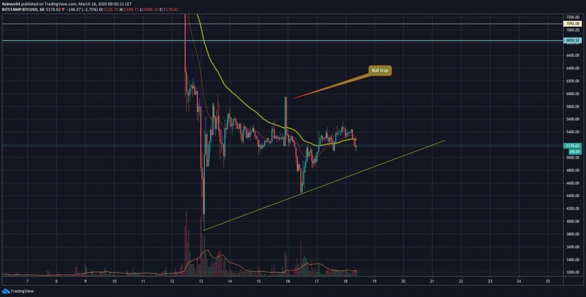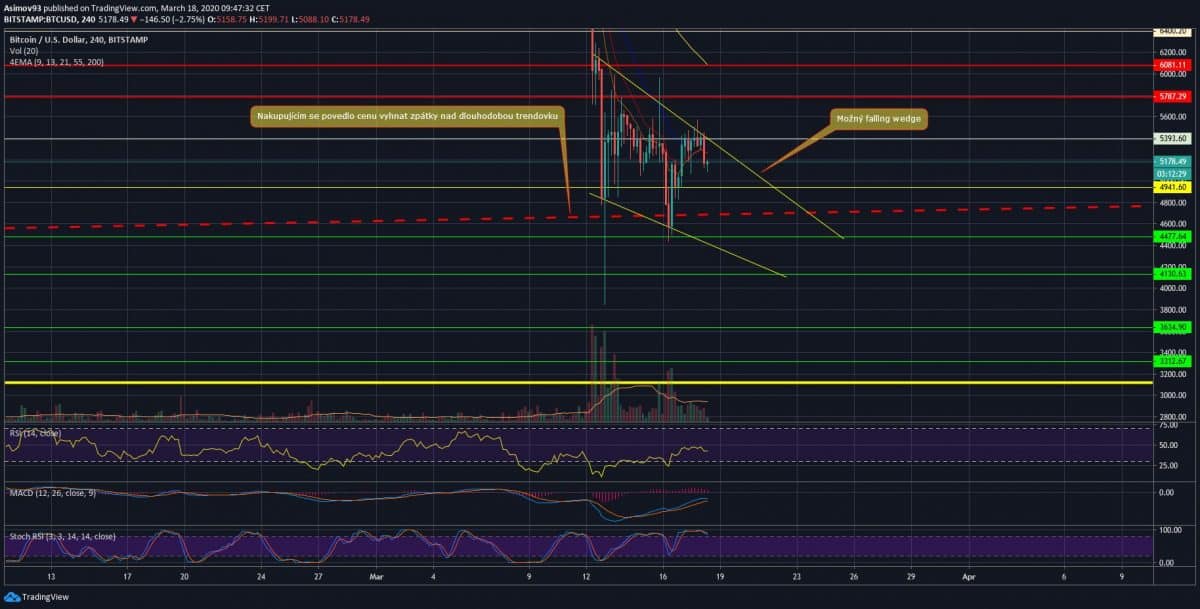 Ten odraz up byl sice mohutný, ale dlouho nevydržel. A ani se nic jiného po takovém poklesu neočekávalo. Od té doby skáče cena nahoru a dolů. V konotaci na absolutní čísla to tak sice nevypadá, ale v relativních číslech se jedná o docela velké pohyb. Někdy je to během několika hodin i 15 %. Největší problém je každopádně v tom, že jsme se ještě nehnuli tzv. z místa a další vývoj jsou pouze odhady. Budu k vám zcela upřímný a můžu vám říci, že technická analýza je v těchto dobách naprosto k ničemu. Tedy, neberte mě doslova, neboť TA nám s jistotou může říci, že aktuální situace je opravdu problém. V souvislosti s odhadováním dalšího vývoje je to ale podstatně horší.