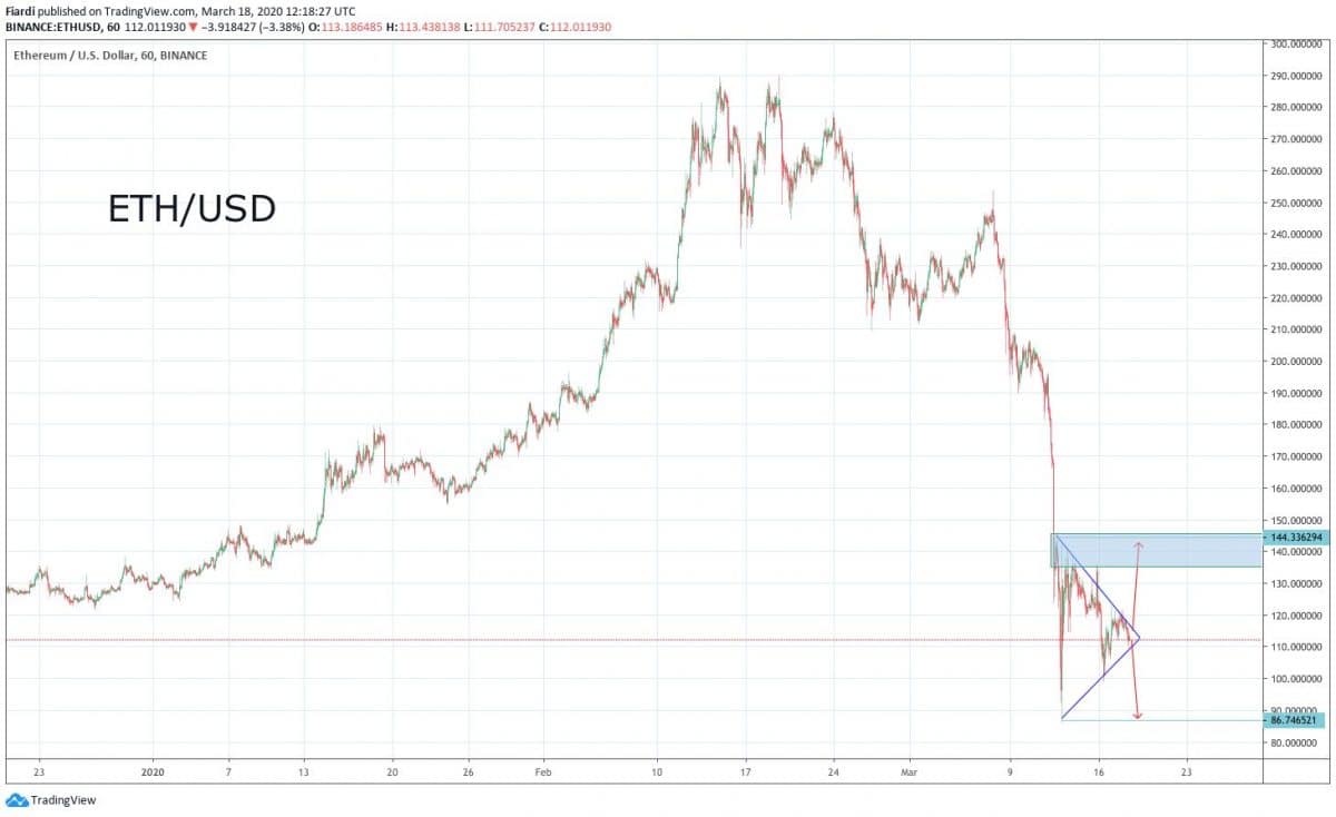 Zároveň vidíme na Ethereu obrovský triangl, který se nám vytvořil v posledních dnech. Tento trojúhelník se začal formovat minulý týden vytvořením dna na 86 USD a následně víkendovým pohybem, kdy došlo k vytvoření vrcholu na 144 USD. Vidíme, že triangl se pomalu ukončuje a u těchto patternů je typické ukončení velkým pohybem směrem nahoru nebo dolů. Podíváme se tedy na nejbližší hladiny supportu a rezistence. Od topu v roce 2020 na 289 USD jsme propadli k současné hodnotě 111 USD, což představuje ztrátu 61,42 %.