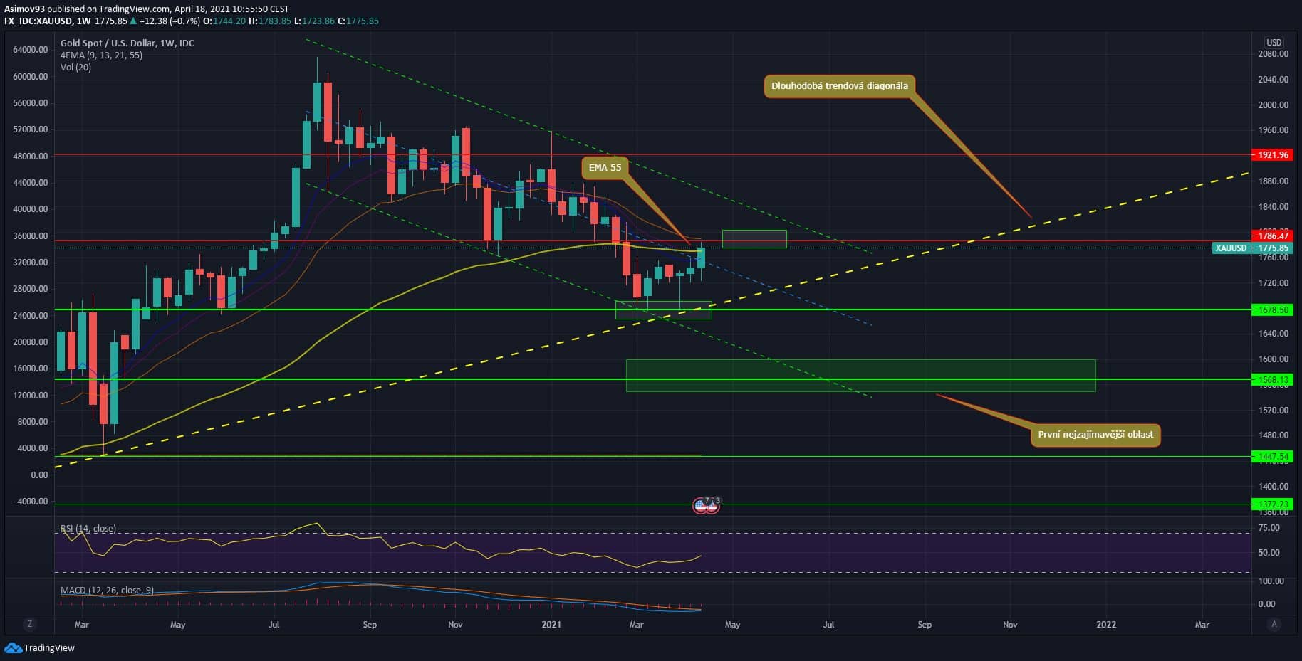 Na týdenním grafu stále platí, že jsme posledních pár týdnů dost bullish. S/R level 1 678 USD/unce býci spolehlivě ubránili a cena pomalu postupuje vpřed. Kurz čerstvě otestoval EMA 55 a dokonce i rezistenci na levelu 1 786 USD/unce. Což jsou nesmírně důležité překážky, které je potřeba prolomit. Jestli cena prorazí i horní stěnu klesajícího kanálu, markantně vzrostou šance na pokračování v dlouhodobém uptrendu.