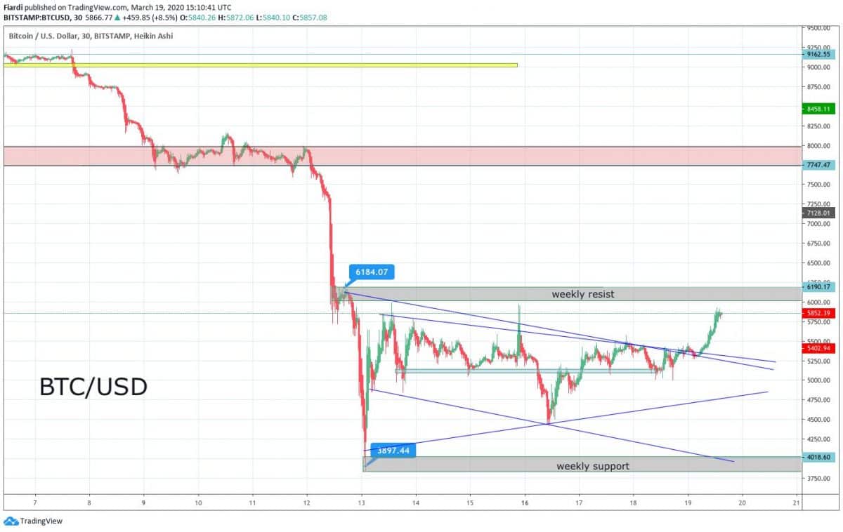 Situace na Bitcoinu by se dala aktuálně přirovnat k loďce na rozbouřených vlnách. Momentálně jsme nad 6 000 USD. Po klidném víkendu Bitcoin čekal jen na jednu věc – jak otevřou světové trhy po opatřeních Fedu snížit dopad na světovou ekonomiku pomohl. Fedu stáhl úrokové sazby o 1% před 2 týdny to bylo o 0,5. Americký Fed srazil sazby na nulu, navíc oznámil masivní kvantitativního uvolňování.