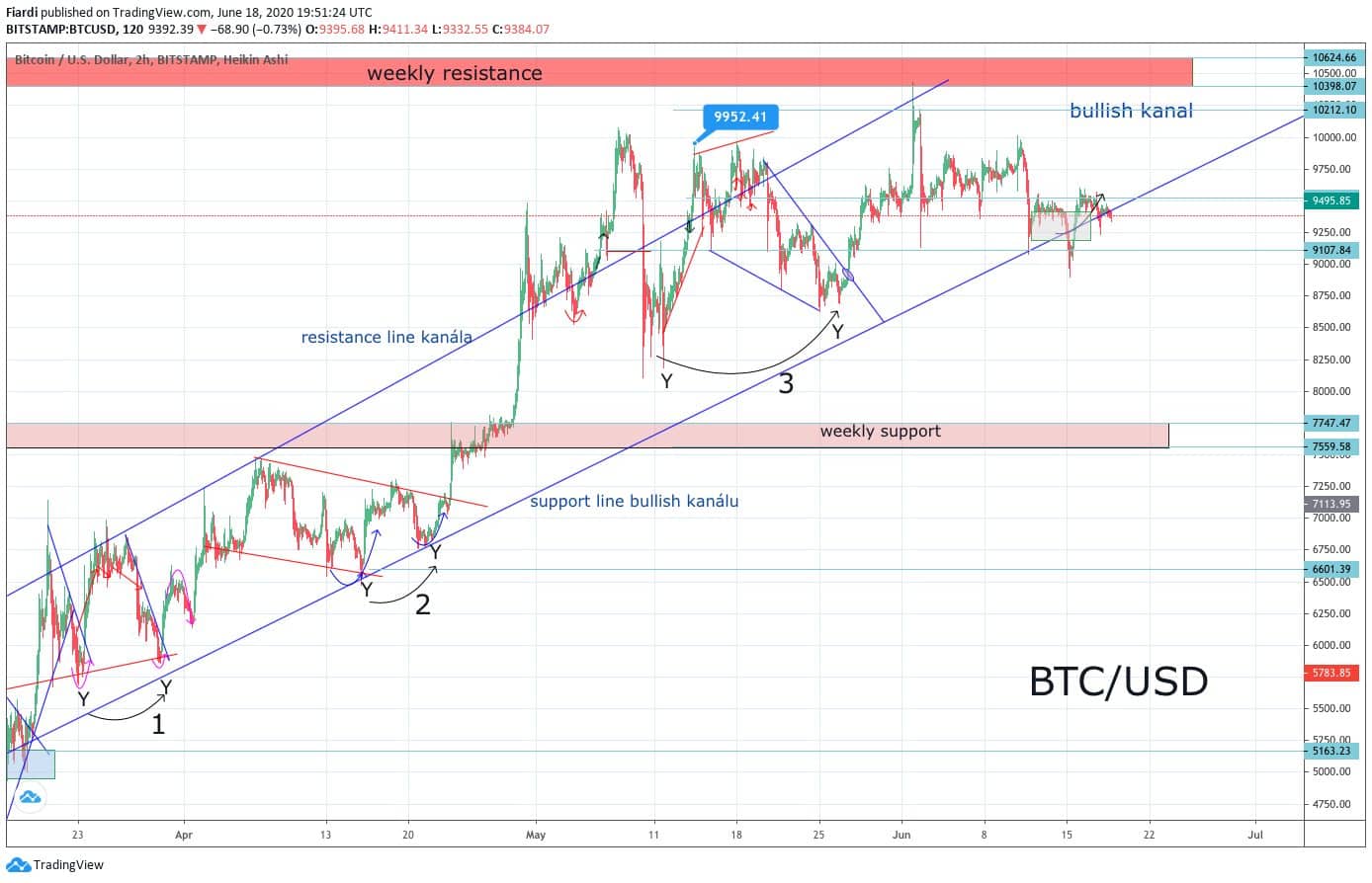 Bitcoin se momentálně pohybuje na 9 390 USD. High včerejšího dne jsme viděli na 9 430 USD. Na grafu vidíme přesný odraz od support line bullish kanálu před pár dny. Podpora zůstává na 9 100 USD, krátce vytvořila jen knot a odrazili jsme se znovu nahoru. Byl to nesmírně důležitý odraz, protože pokud by k němu nedošlo, Bitcoin by vytvořil bearish kanál k možným 7 700 USD. Momentální pohyb je ale stále v bullish kanálu s tím vědomím, že v dohledné době 2-3 týdnů musíme prolomit 10 000 USD.