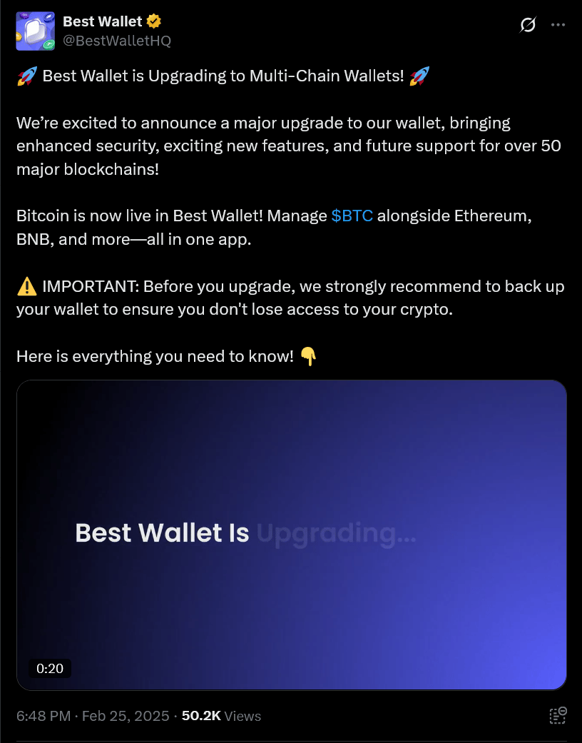 Best Wallet je moderní krypto peněženka, která za méně než rok přilákala přes 500 000 uživatelů. Tento raketový rozvoj je dán pokročilými funkcemi a výhodami, jako jsou rychlejší a levnější transakce ve srovnání s MetaMask a Trust Wallet. Díky integraci s více než 200 decentralizovanými protokoly a 20 cross-chain mosty je Best Wallet jednou z nejkomplexnějších peněženek na trhu.