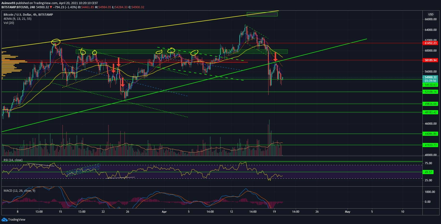 Co se týče 4H grafu, zamítnutí na spodní hraně klínu je zřetelné, ale následný pokles neměl příliš velkou sílu. Býci propad zastavili na 54 530 USD a u této úrovně kurz stále konsoliduje. Tudíž je dost možné, že Bitcoin brzy atakuje S/R level 58 189 USD a v závislosti na reakci ceny, se dozvíme, jaké jsou šance na růst.