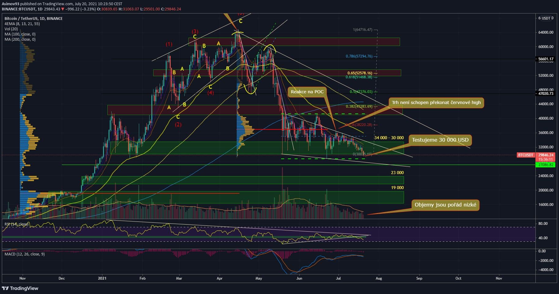 Konečně se dostáváme ke grafu BTC. Bitcoin dnes prorazil těch 30 000 USD, ale zatím je volatilita průměrná a objemy zůstávají hodně podprůměrné. Zdá se, že trh průlom kulatých 30 000 USD nebere až tak vážně, nebo nevím, jak jinak vysvětlit aktuální situaci. Respektive mi není moc jasné, proč trh tak otálí a je bez dynamiky.