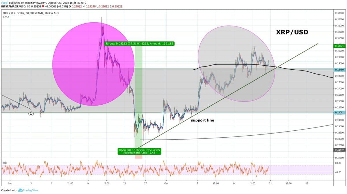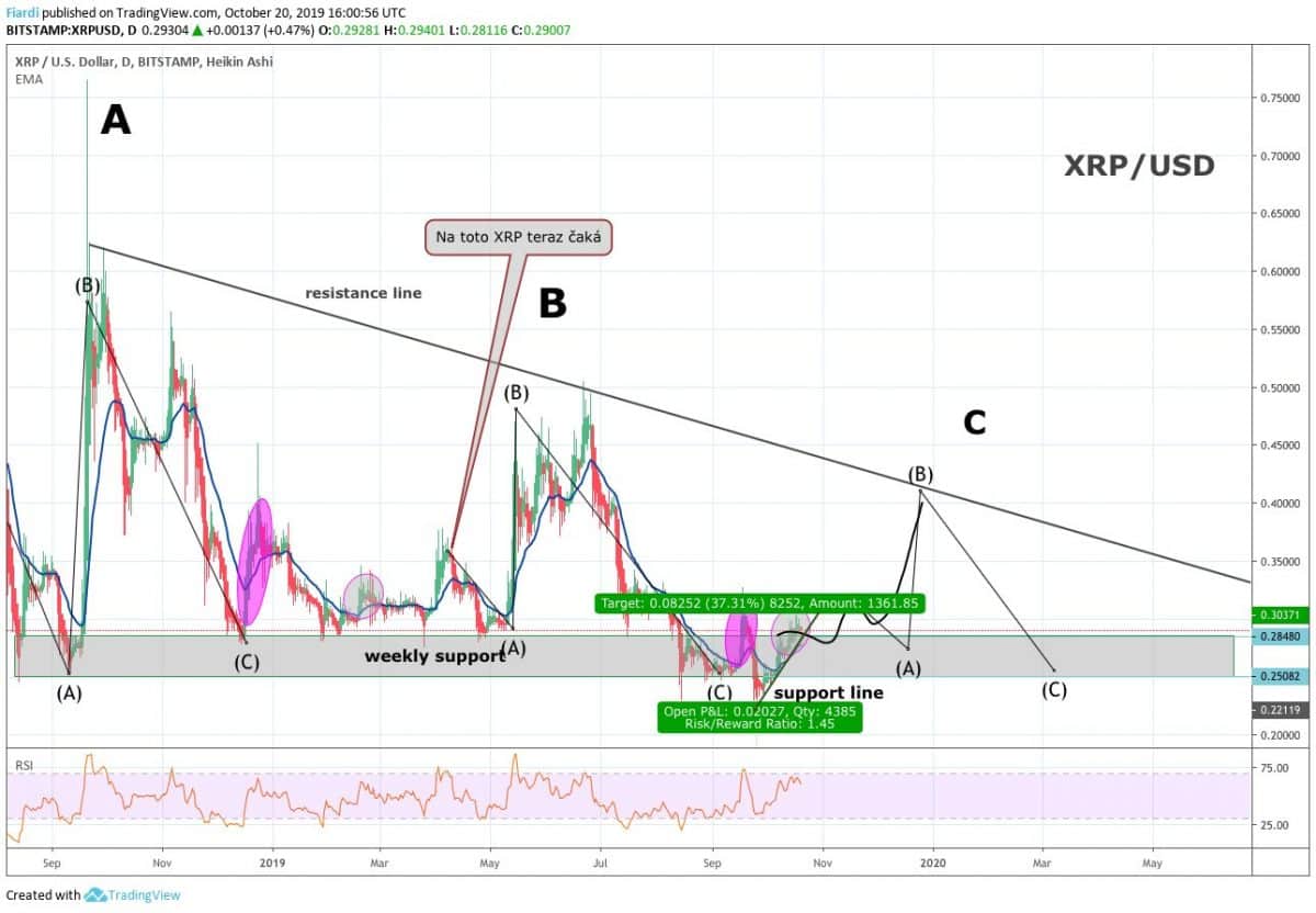 Vítejte obchodníci u dalšího pohledu na XRP/USD a zhodnocení jeho 37% nárůstu na hodnotě. Momentální cena se pohybuje těsně pod 0,30 USD za kus. Růst na XRP lze připsat hned dvěma důvodům. Ten první hovoří o tom, že propad který byl vyvolaný létem, momentálně skončil a XRP se nám snaží dostat do supportu, který tu máme už téměř rok a půl. Tento support se v převážné části pohybuje na 0,25-0,285 USD.
