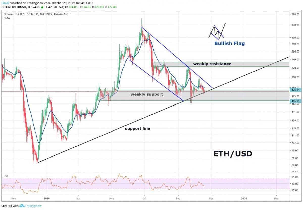 Vítejte obchodníci u dalšího pohledu na ETH/USD. Na grafu mám pattern: Bullish Flag který je stále otevřený. ETH momentálně porostl o 13% od 27.09.19, no pokud se prolomí support line kterou vidíte na grafu celá strategie Bullish Flag vyjde zbytečná. ETH momentálně bude bojovat o to, aby udržel své hodnoty nad 170 USD tedy nad support line. Pokud by byla hodnota 170 USD prolomena výrazně k 160 USD, obávam se, že se otevře cesta k propadu na nejbližším supportu 135 USD. Zní to velmi hrůzostrašně a tento scénář je podle mě reálný pouze na 40%. Očekávám, že by se ETH mohl odrážet na současném 156-170 USD supportu.