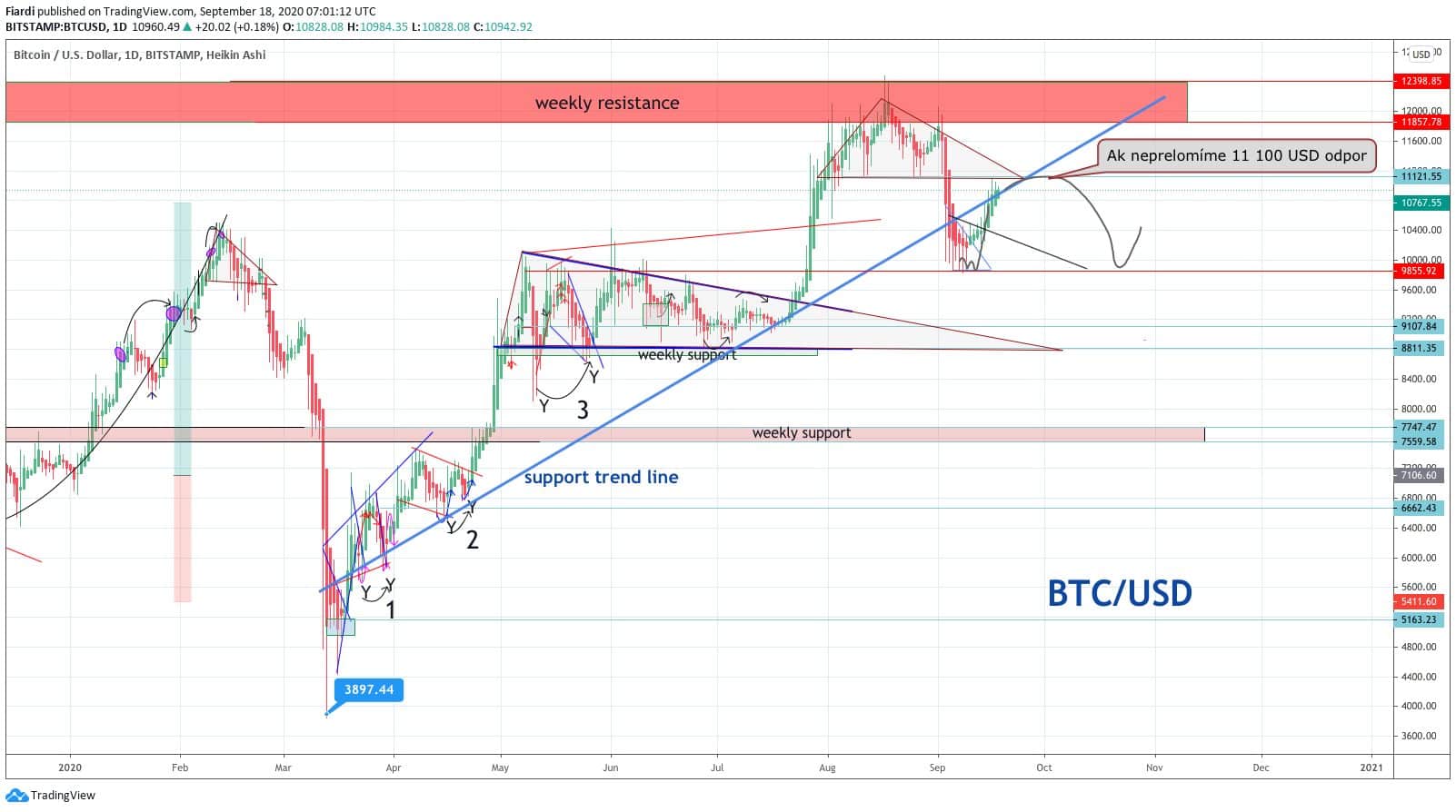 2. Pokud prolomíme 11 100 USD, znovu jsme ve hře o bullish a růst bude pokračovat směrem k 11 800-12 000 USD. Znovu se bude bojovat o to, abychom tu hodnotu 12 000 USD prolomili a následný boj bude o 14 000 USD. Vše ale záleží na tom, zda prolomíme 11 100 USD. Třeba se zařídit i s altcoiny, proto je tak těžké teď říci, jestli něco kupovat, či prodávat, abychom nebyli ve ztrátě. Prostě jinak to teď nejde, musí se počkat, co bude na 11 100 USD.