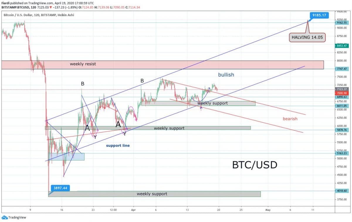 Co se týče odporu, tak ten vidíme na 7 300 a následně 7 700 USD vážný odpor. Pokud se budeme držet v rámci bullish kanálu, mohli bychom vidět hodnoty růst k 9 000 do halvingu (14.05.20).