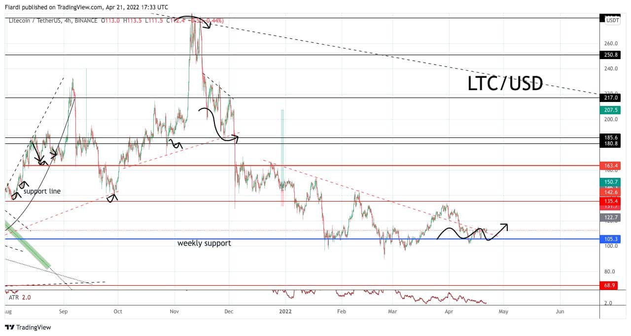Síť Litecoin zaznamenala kolem svého lokálního cenového minima 105 dolarů masivní nárůst transakcí ze strany velryb (velkých investorů). Na tyto novinky upozornila společnost Santiment, která zveřejnila údaje o tom, že Litecoin dosáhl 14. dubna nejvyššího počtu denních transakcí nad 100 000 dolarů za posledních 11 měsíců. V tento den bylo během 24 hodin uskutečněno až 5508, jejichž individuální hodnota přesahovala 100 000 dolarů.